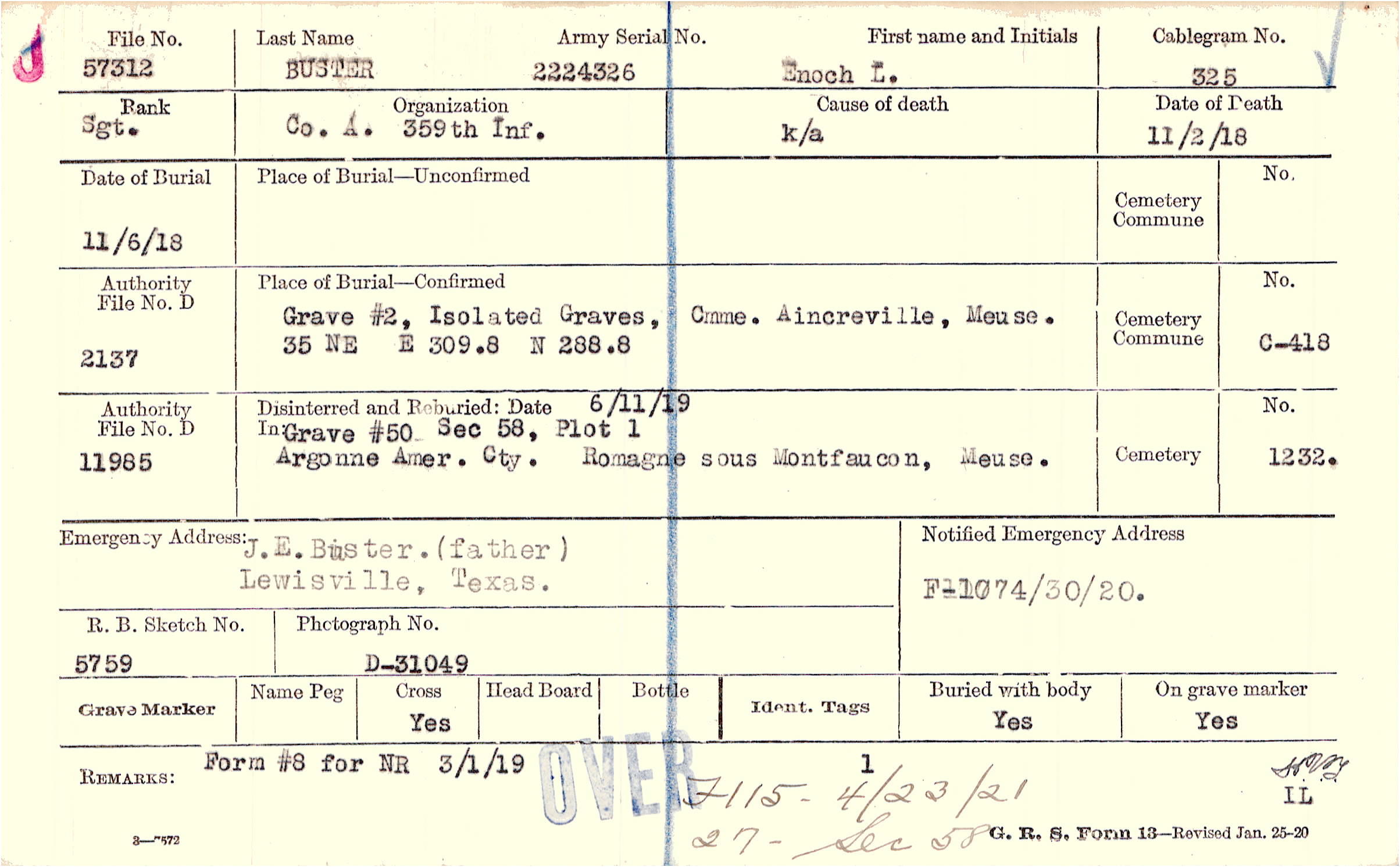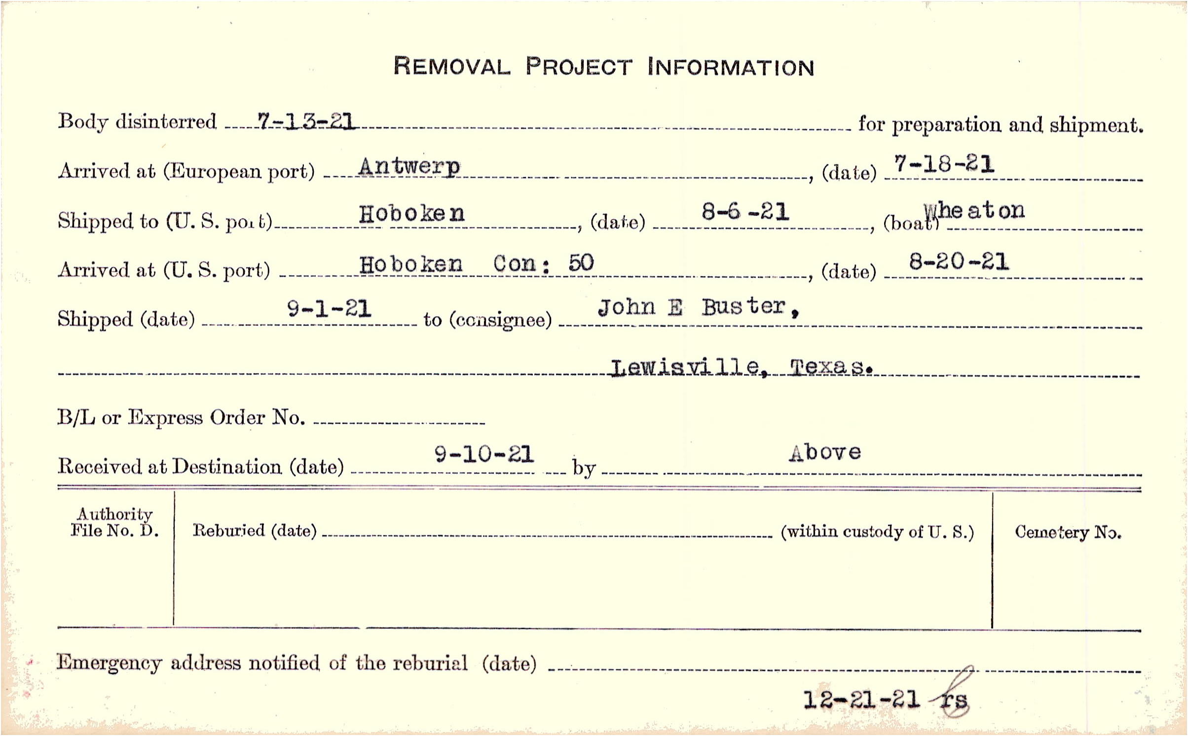 Body disinterred 7/13/1921 for preparation and shipment.