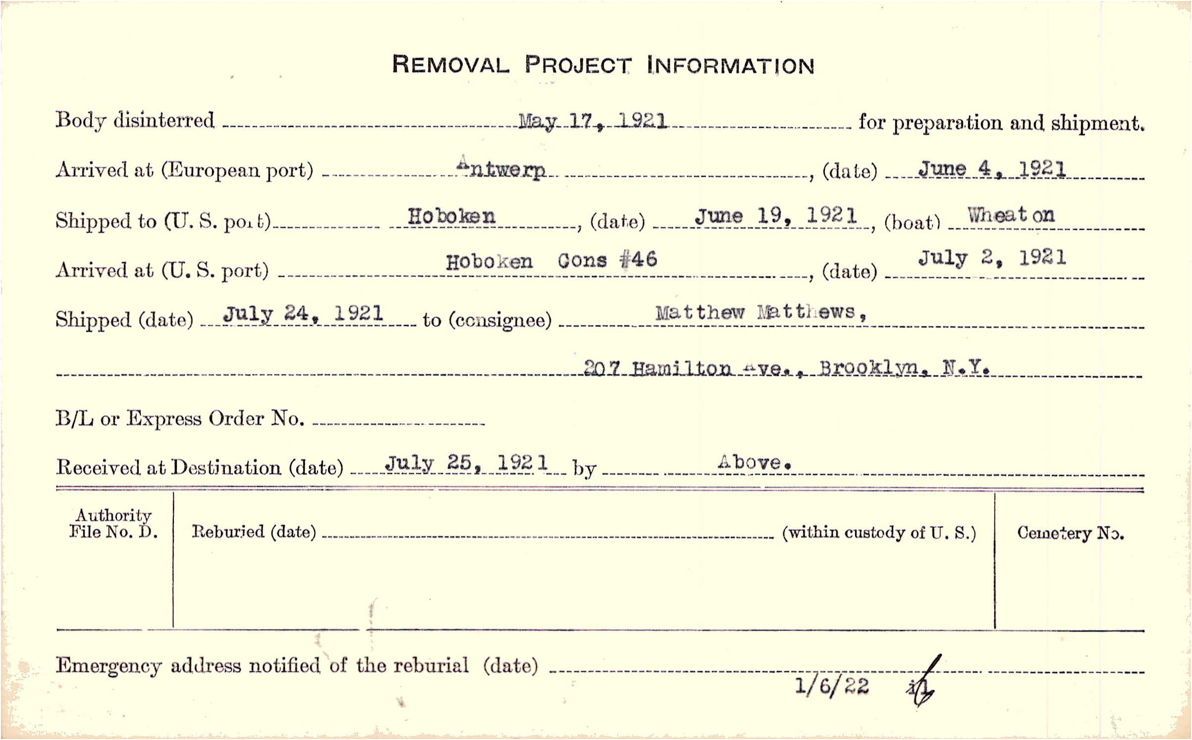 Body disinterred 5/17/1921 for preparation and shipment.