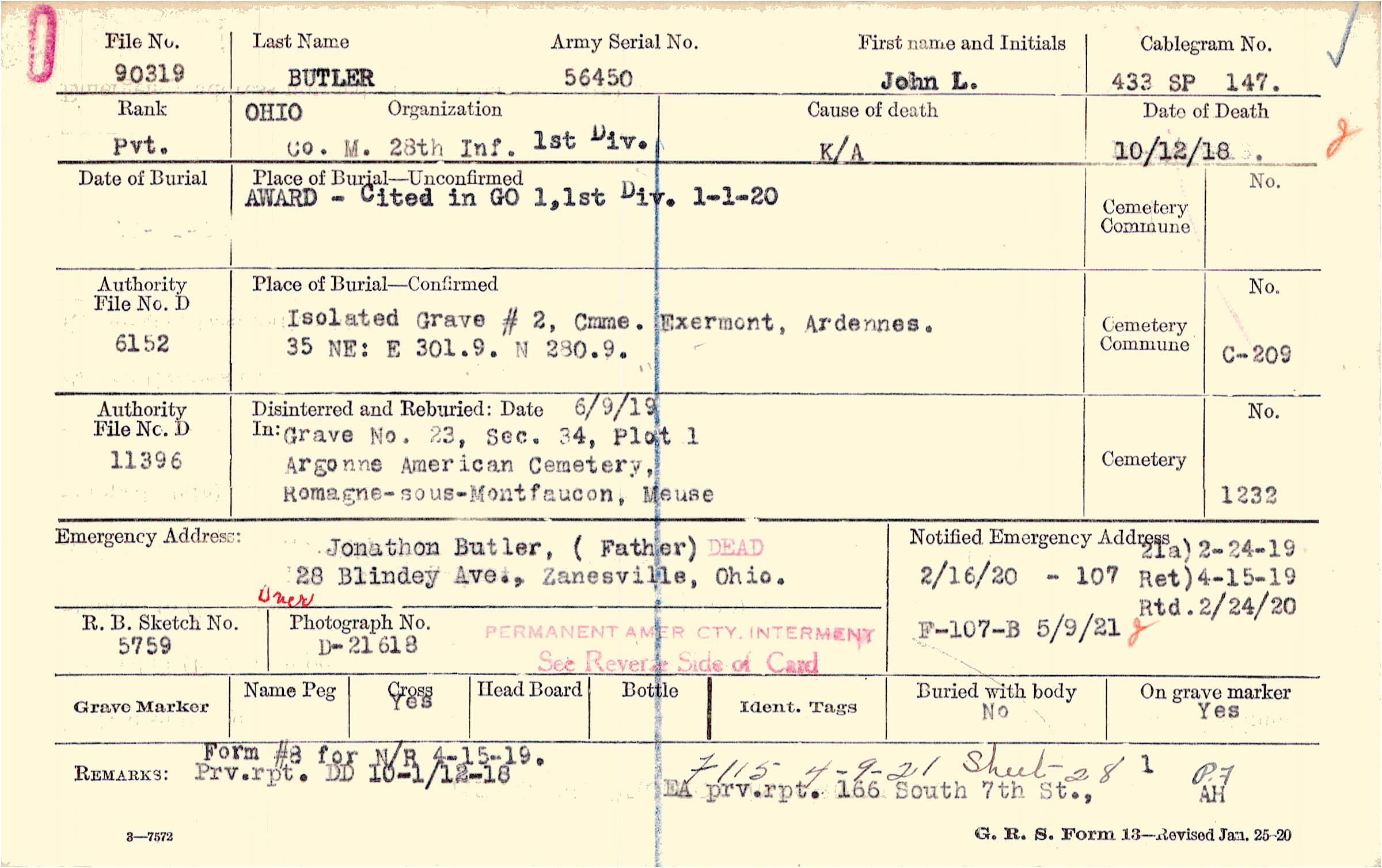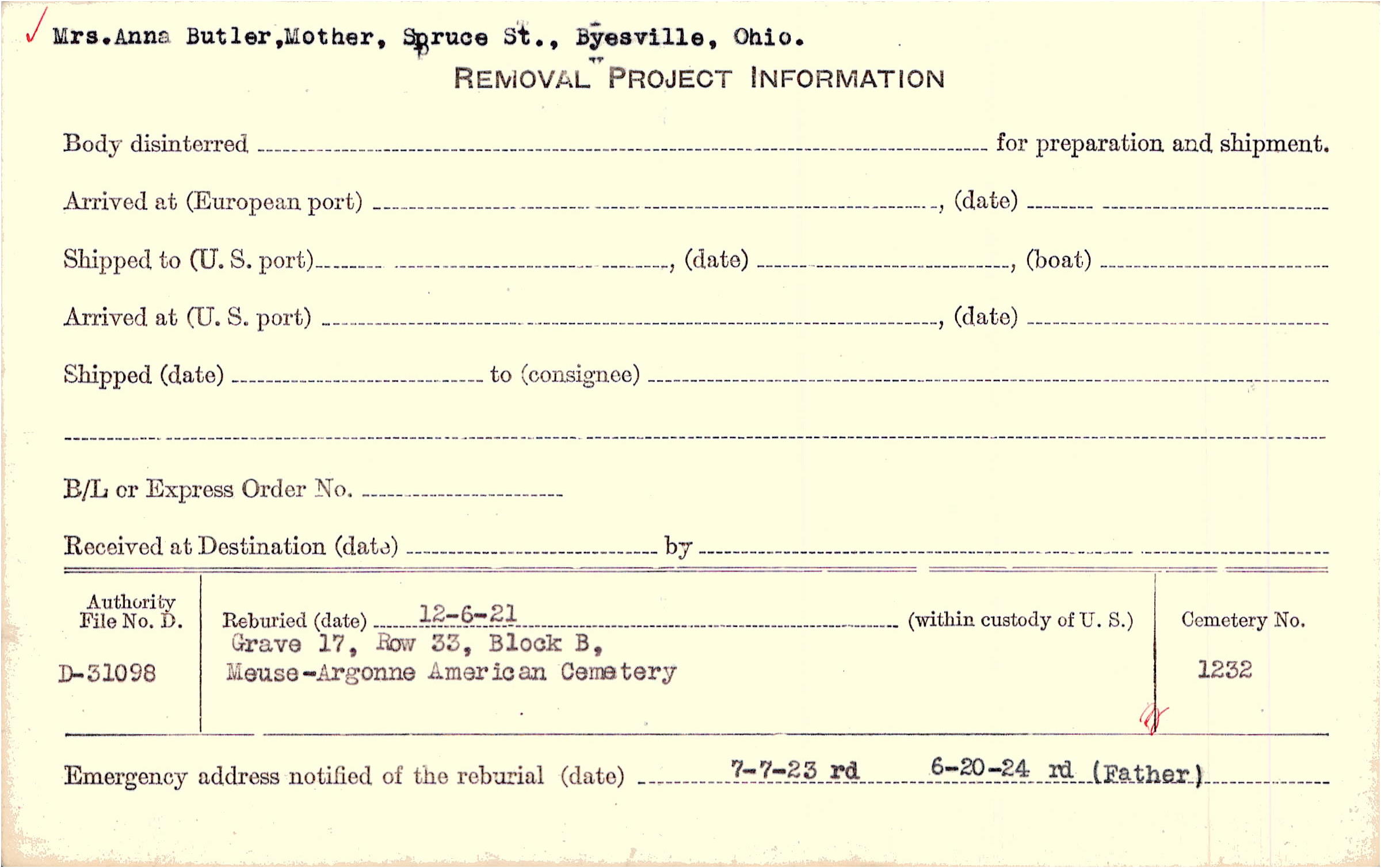 Mrs. Anna Butler, Mother, Spruce St., Byesville, Ohio. (Father) |