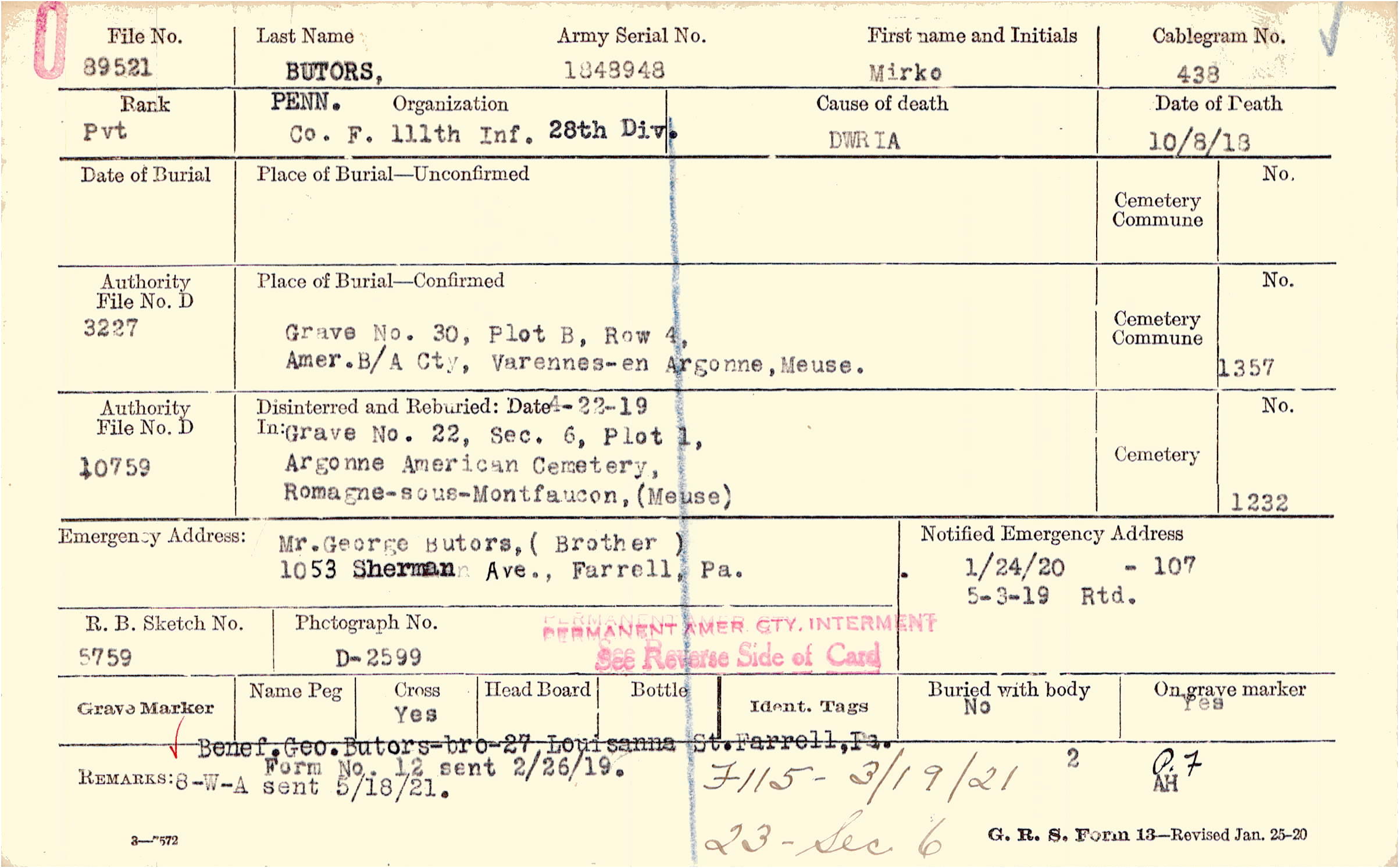 8-W-A sent 5/18/21., Form No.12 sent 2/26/19. Benef.Geo.Butors-bro-27 Louisanna St.Farrell,Pa., F115 - 3/19/21 23 - Sec 6