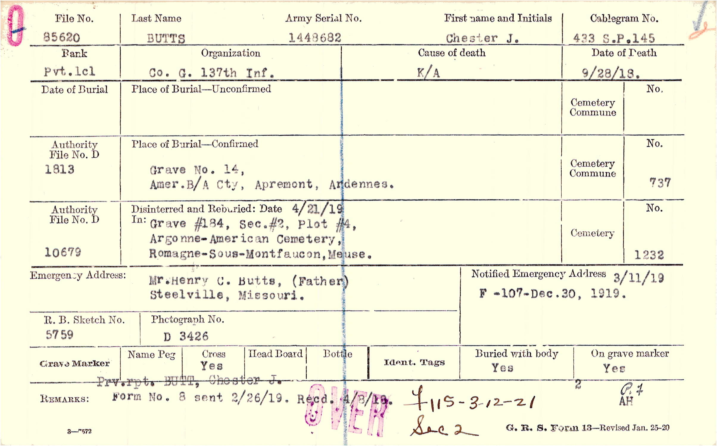 Grave 14, Amer. B/A Cty., Apremont, Ardennes.