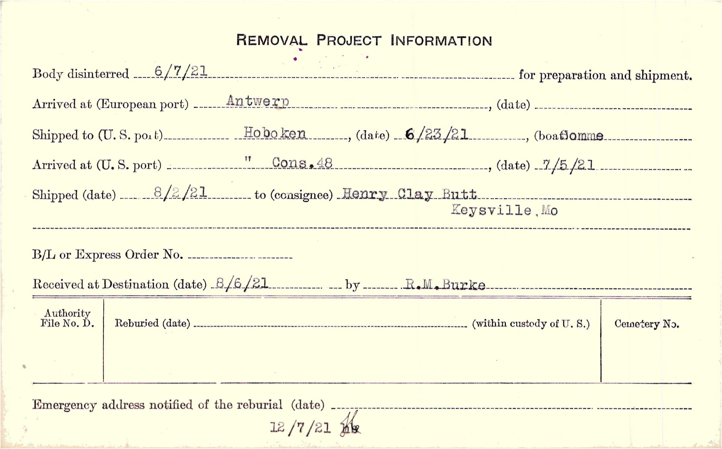 Body disinterred 6/7/1921 for preparation and shipment.