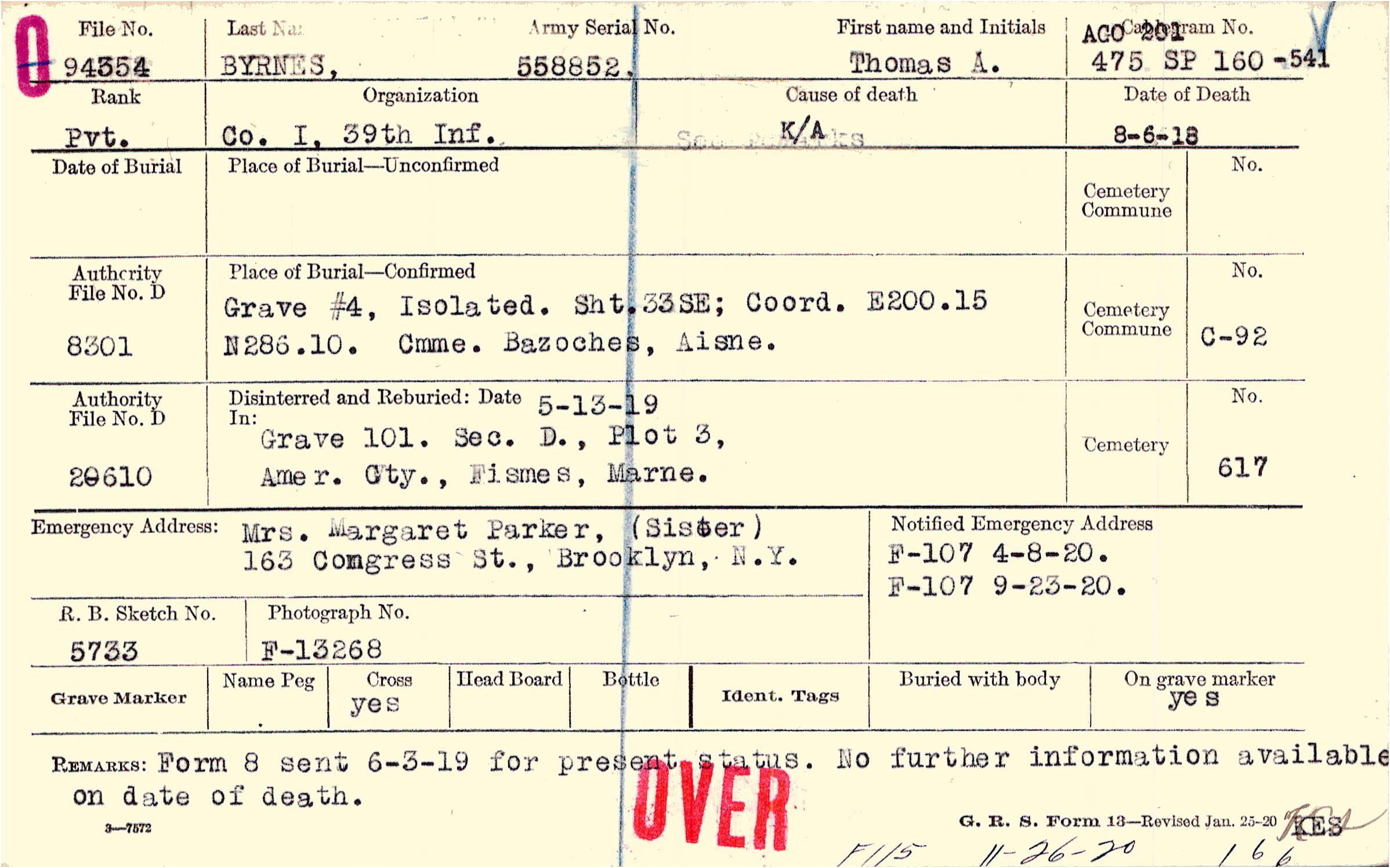 Form 8 sent 6-3-19 for present status. No further information available on date of death, F115 11-26-20 166