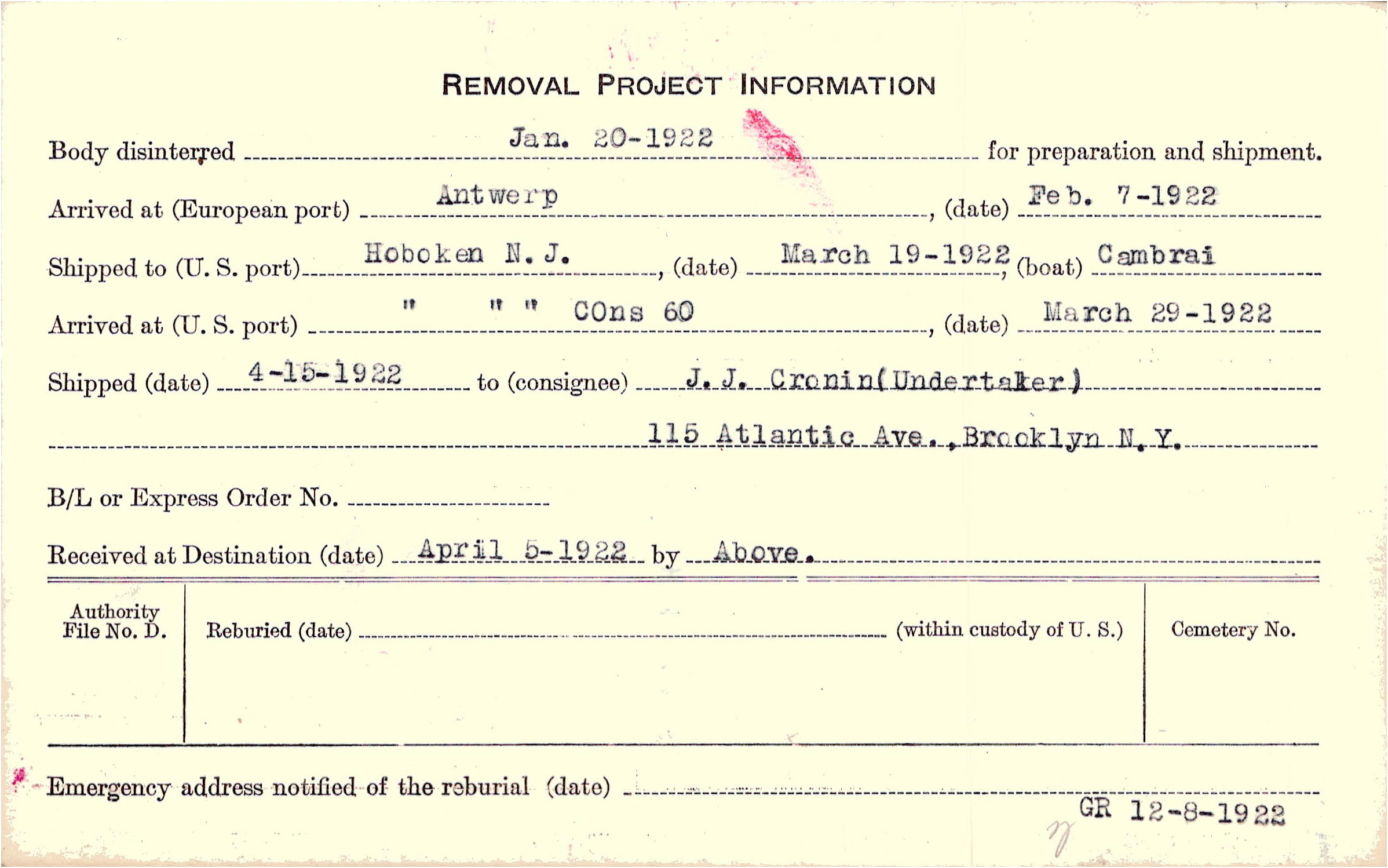 Body disinterred 1/20/1922 for preparation and shipment.