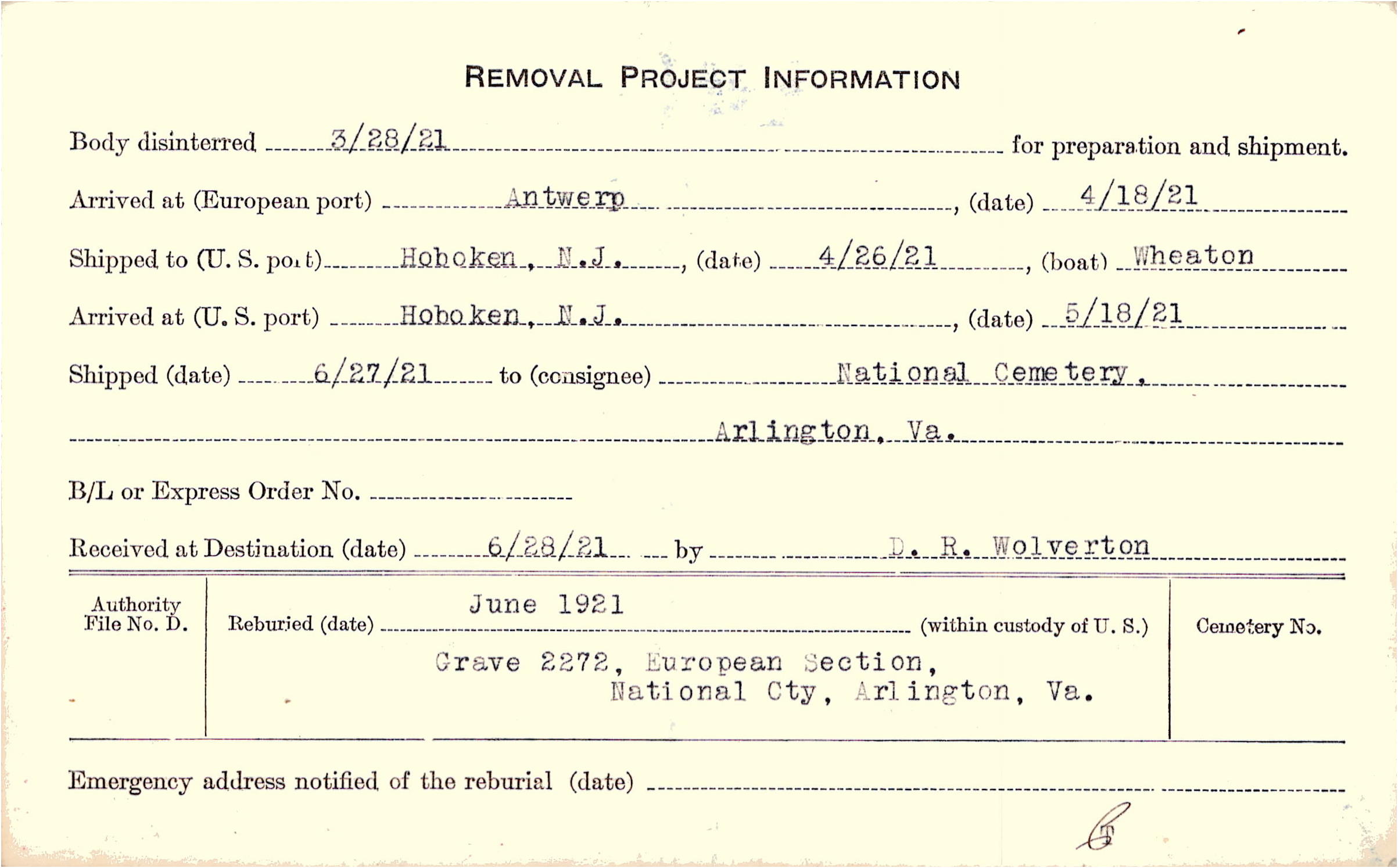 Body disinterred 3/28/1921 for preparation and shipment.