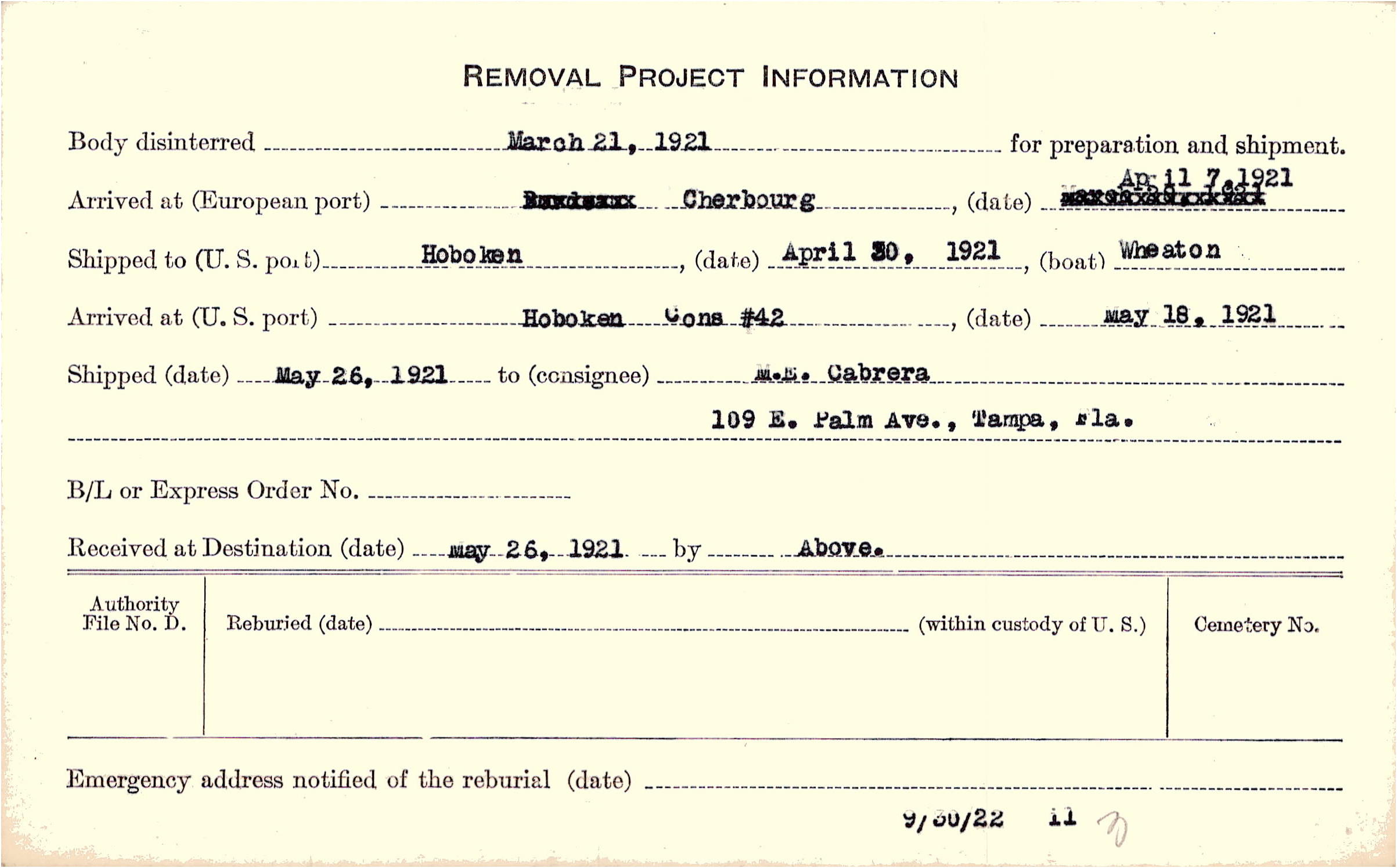 to M. E. Cabrera, 109 E. Palm Ave., Tampa, Fla.