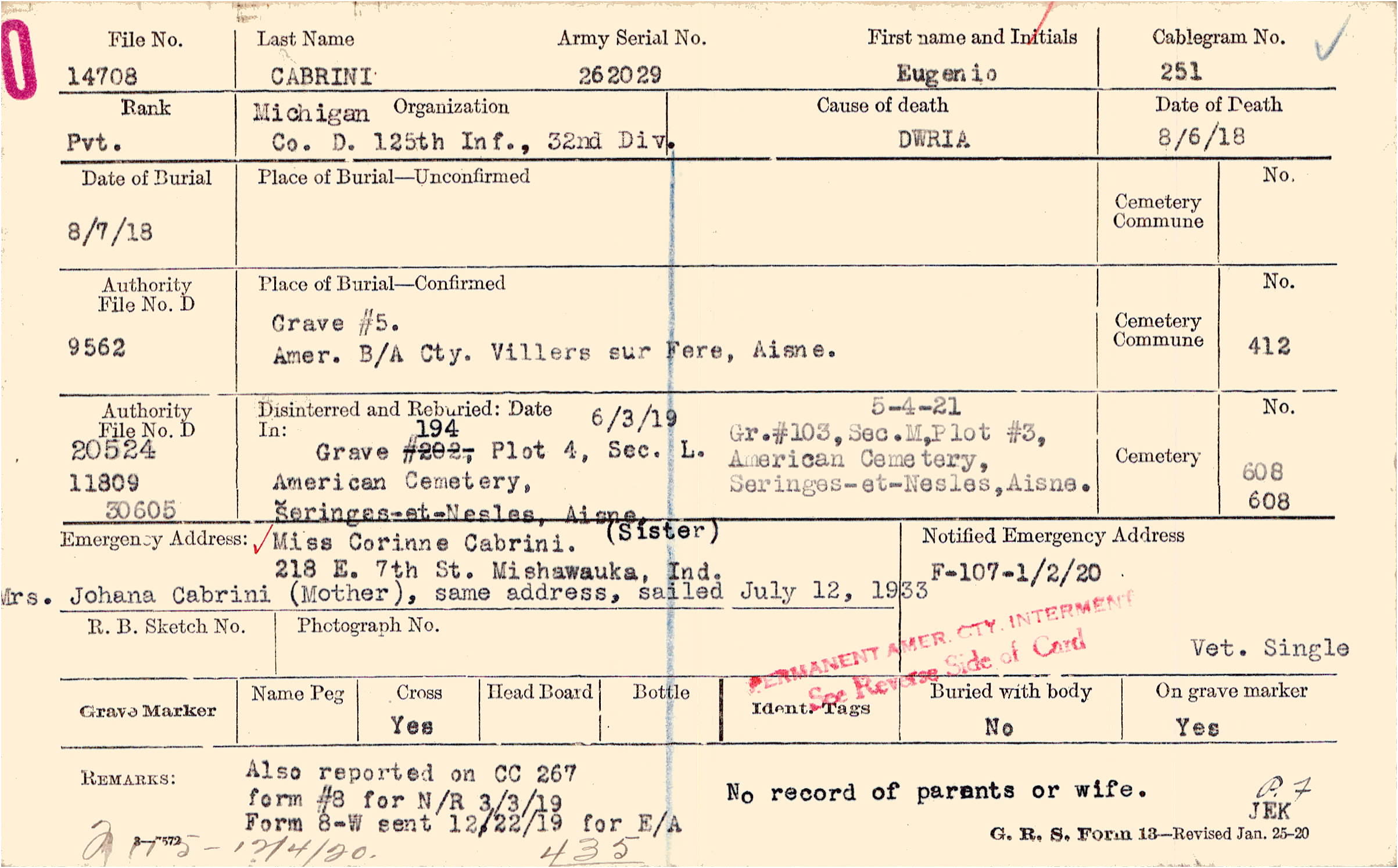 Miss Corinne Cabrini. (Sister), 218 E. 7th St. Mishawauka, Ind., Mrs. Johana Cabrini (Mother), same address, sailed July 12, 1933 No record of parents or wife.