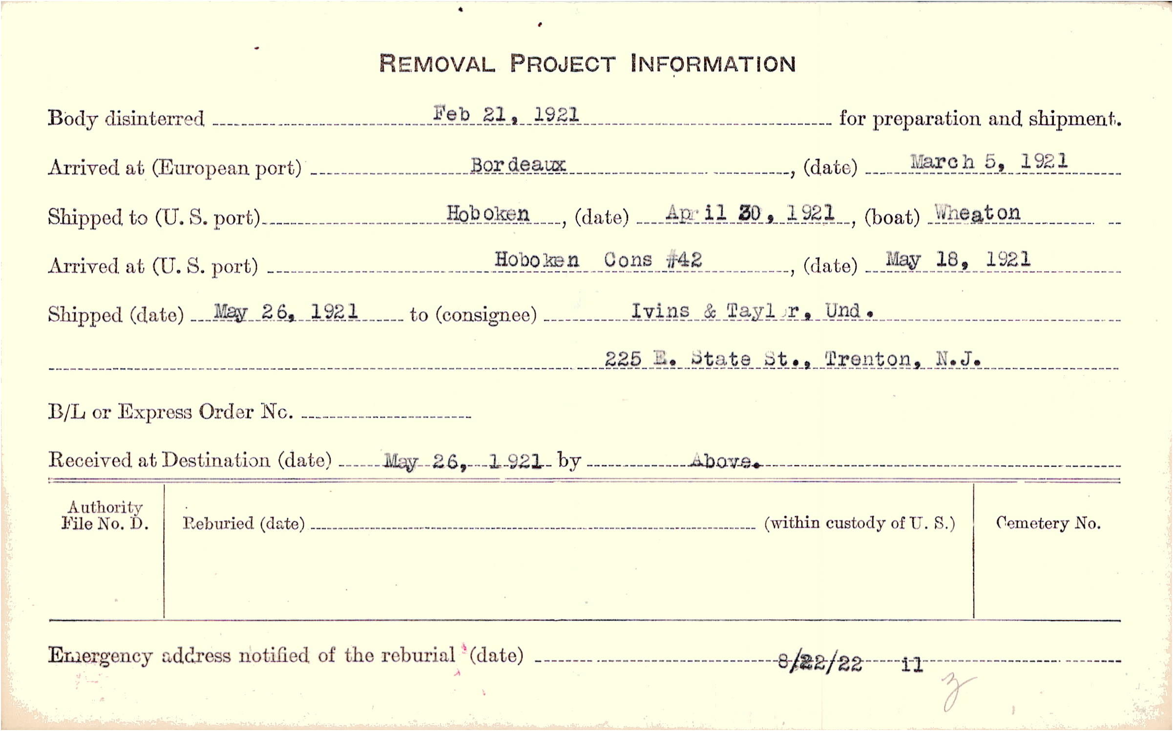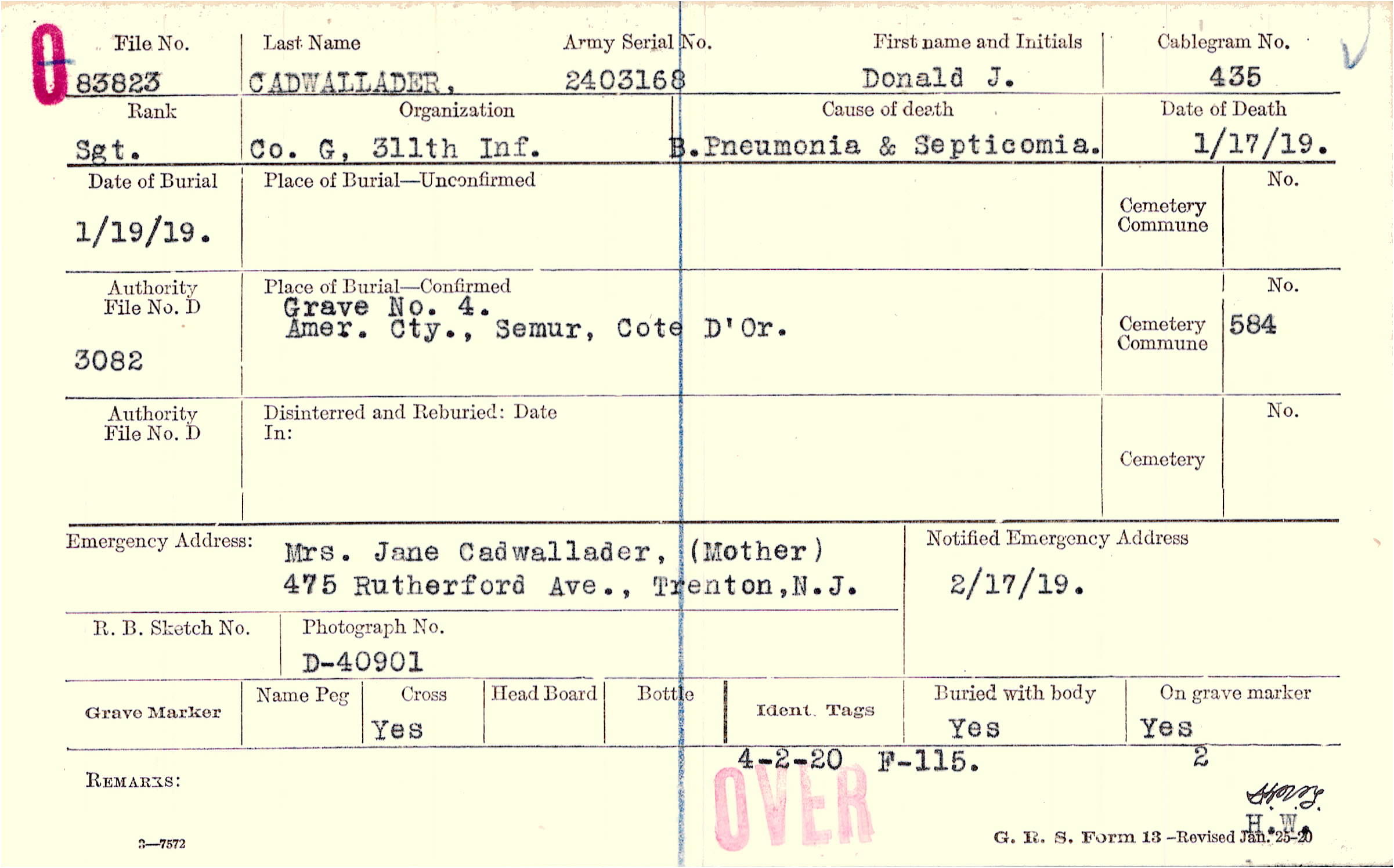 Mrs. Jane Cadwallader, (Mother), 475 Rutherford Ave. , Trenton, N.J.