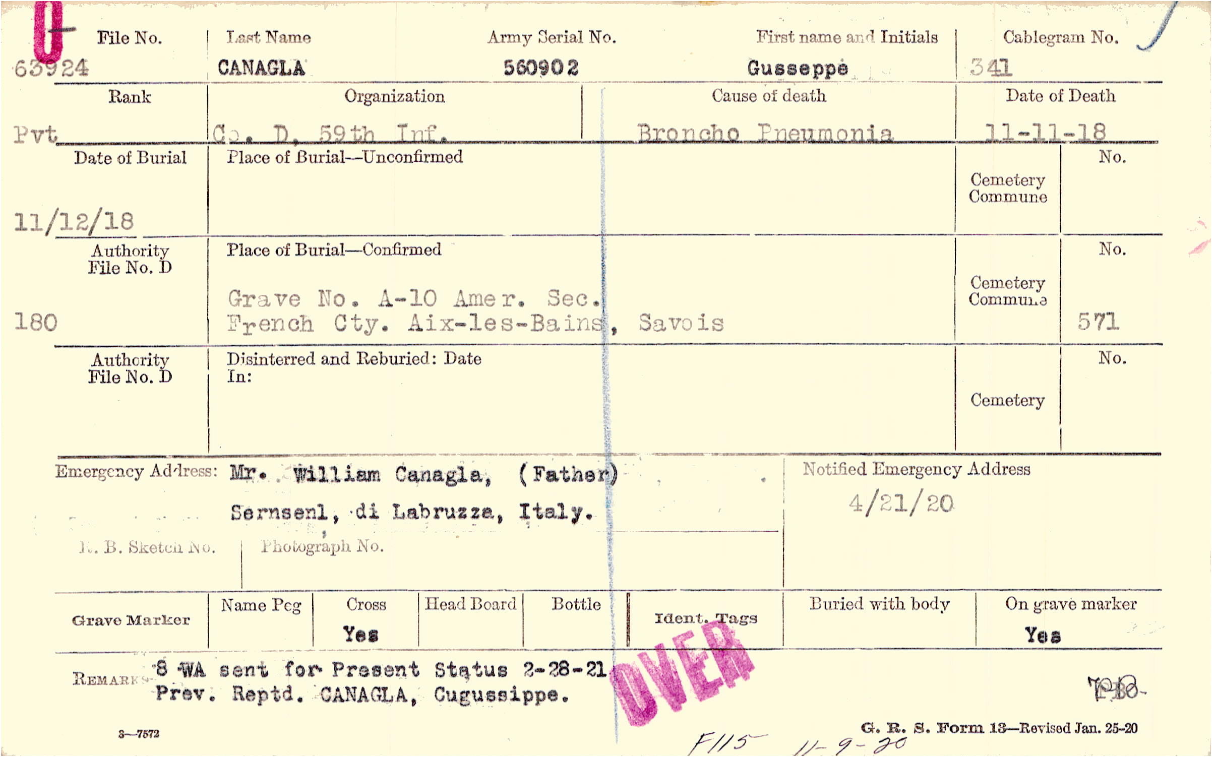 Mr. William Canagla, (Father), Sernsenl, di Labruzza, Italy.