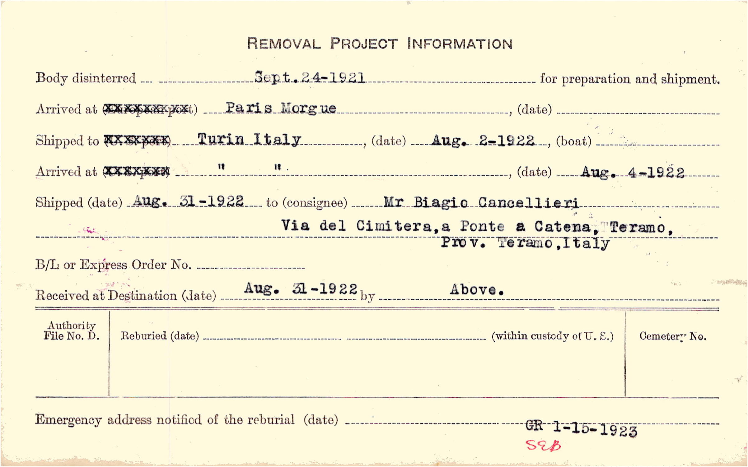 Body disinterred 9/24/1921 for preparation and shipment.