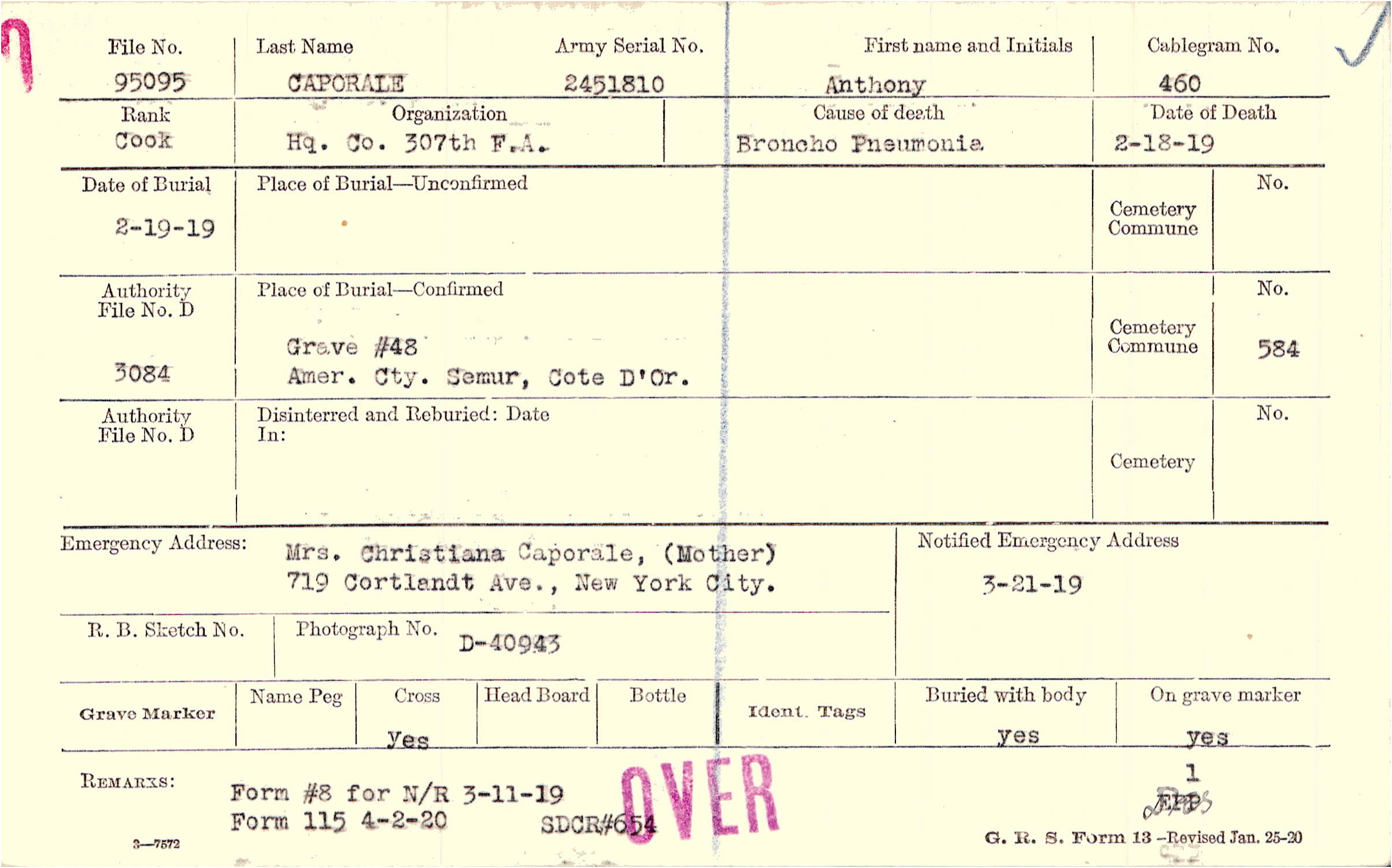 Mrs. Christiana Caporale, (Mother), 719 Cortlandt Ave., New York City.