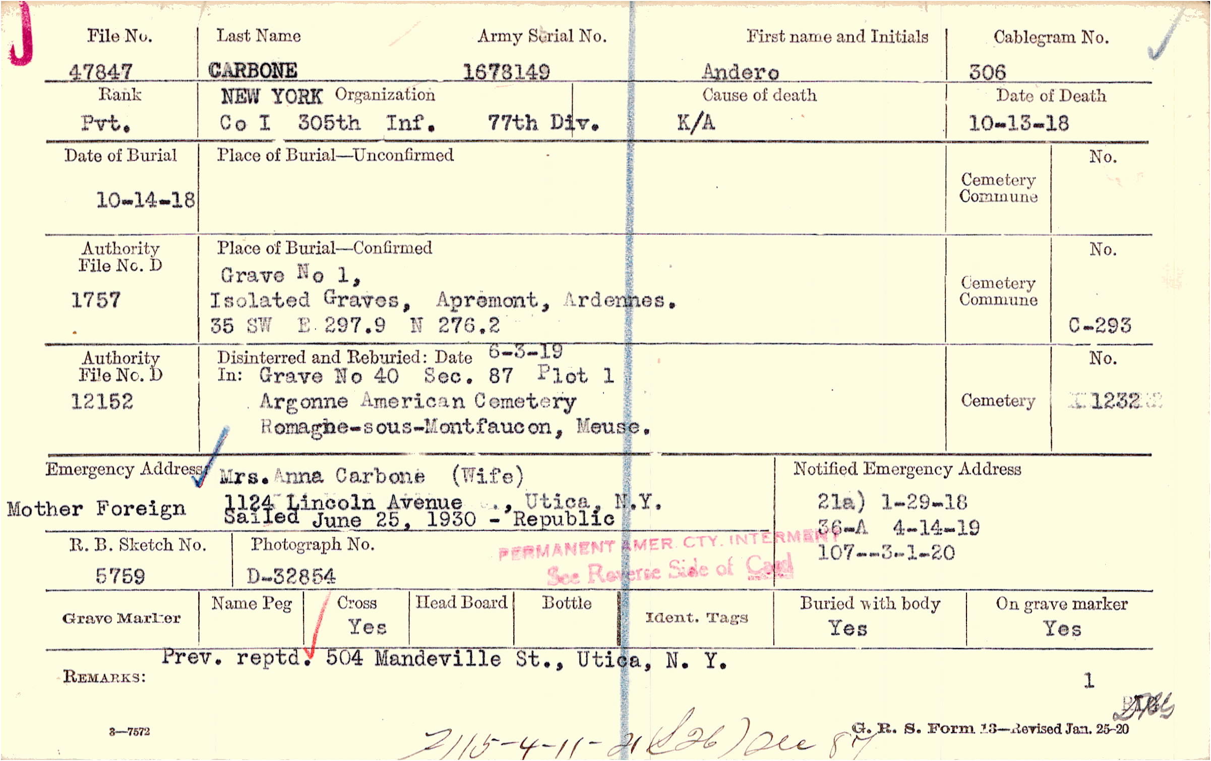 Mrs. Anna Carbone (Wife), 1124 Lincoln Avenue , Utica, N.Y., Mother Foreign Sailed June 25, 1930 - Republic