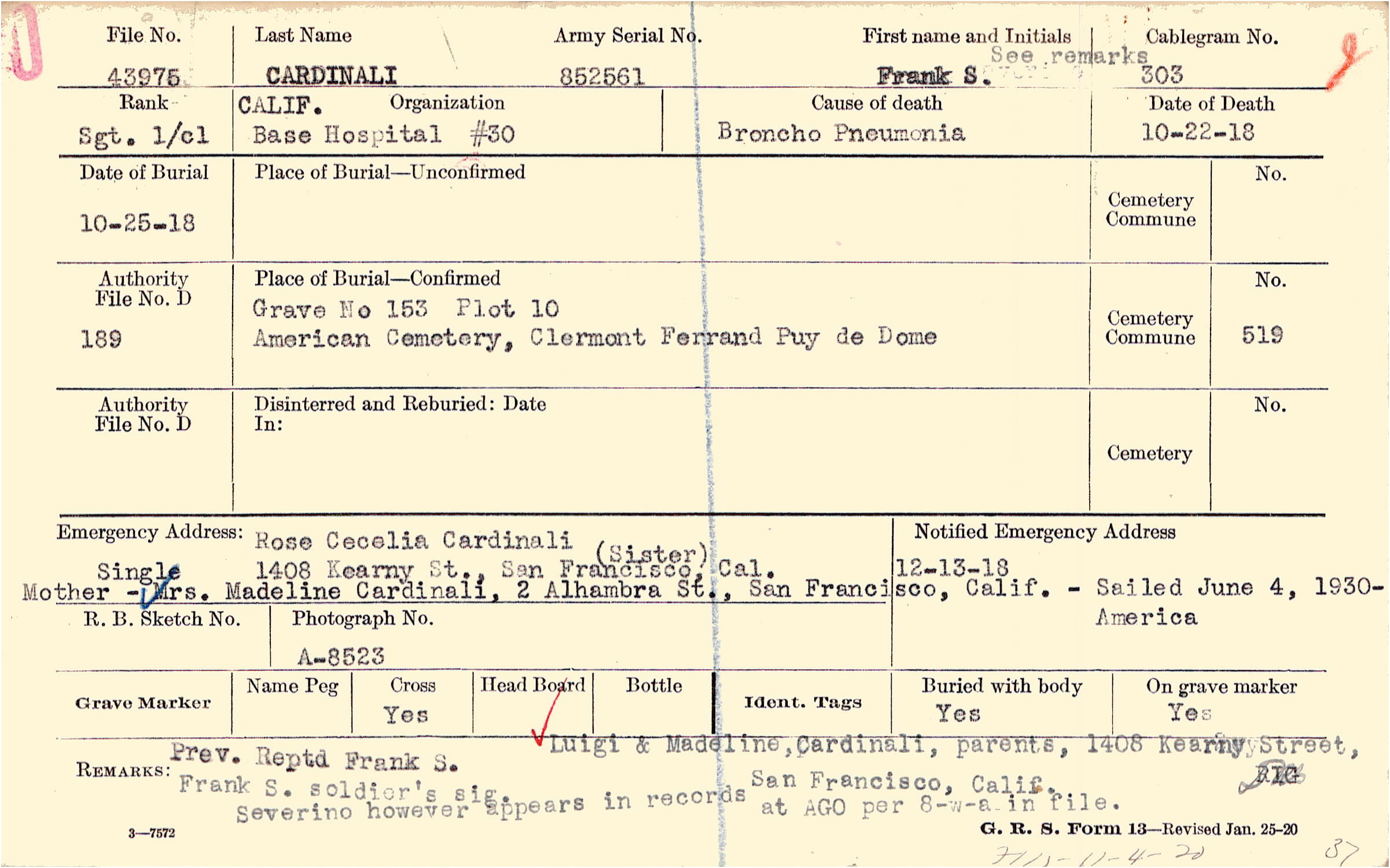 Pref. Reptd Frank S. Frank S. soldier's sig. Severino however appears in records at AGO per 8-w-a in file. Luigi & Madeline, Cardinali, parents, 1408 Kearny Street, San Francisco, Calif., F115 11-4-20 37