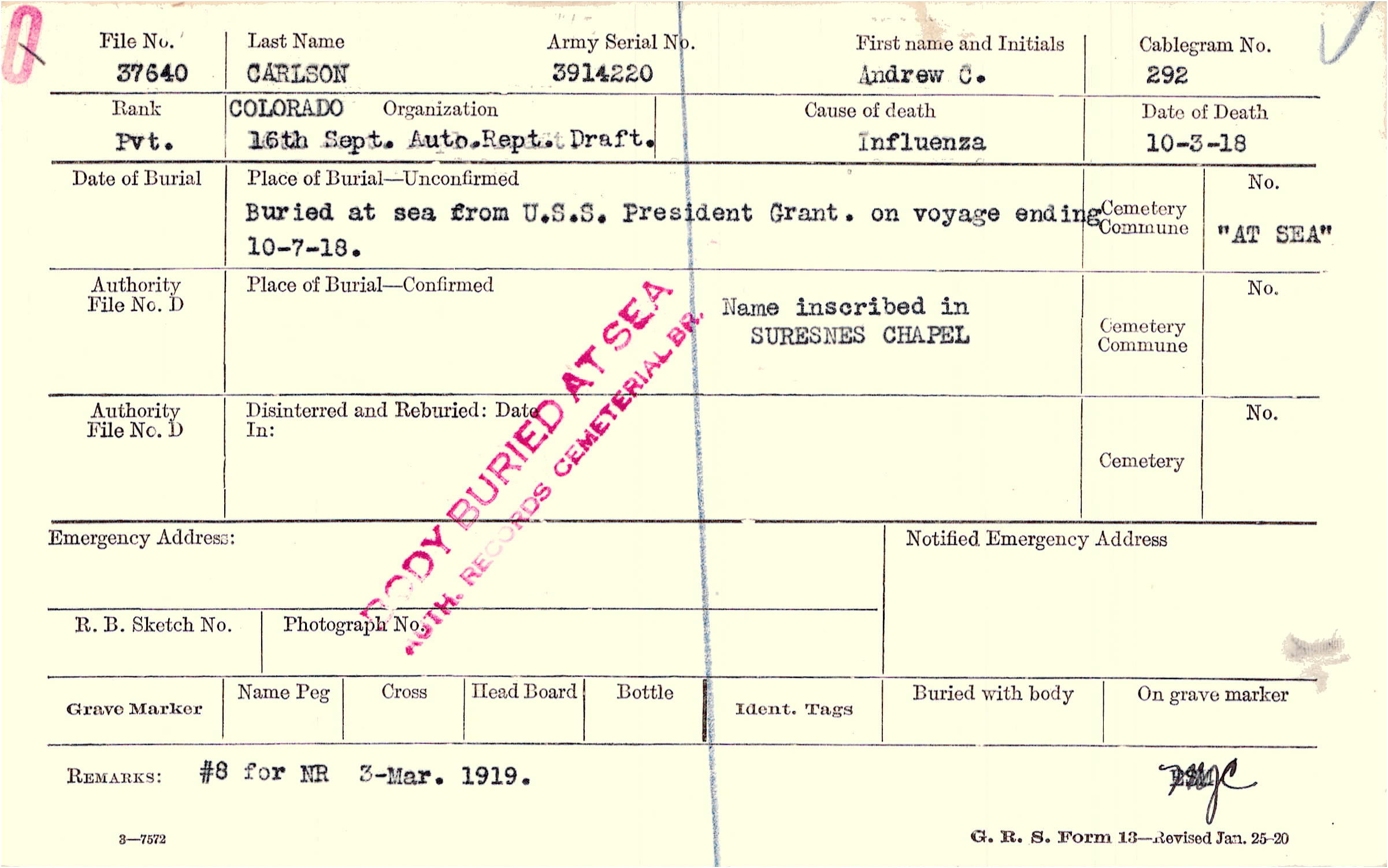 Buried at sea from U.S.S. President Grant. on voyage ending 10-7-18.