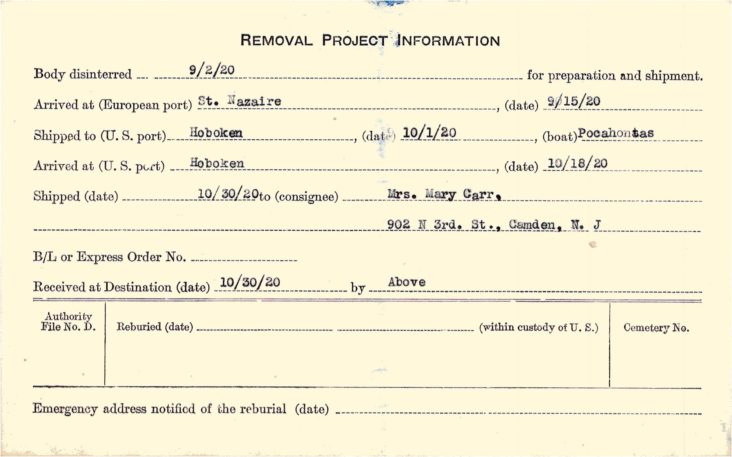 Body disinterred 9/2/1920 for preparation and shipment.