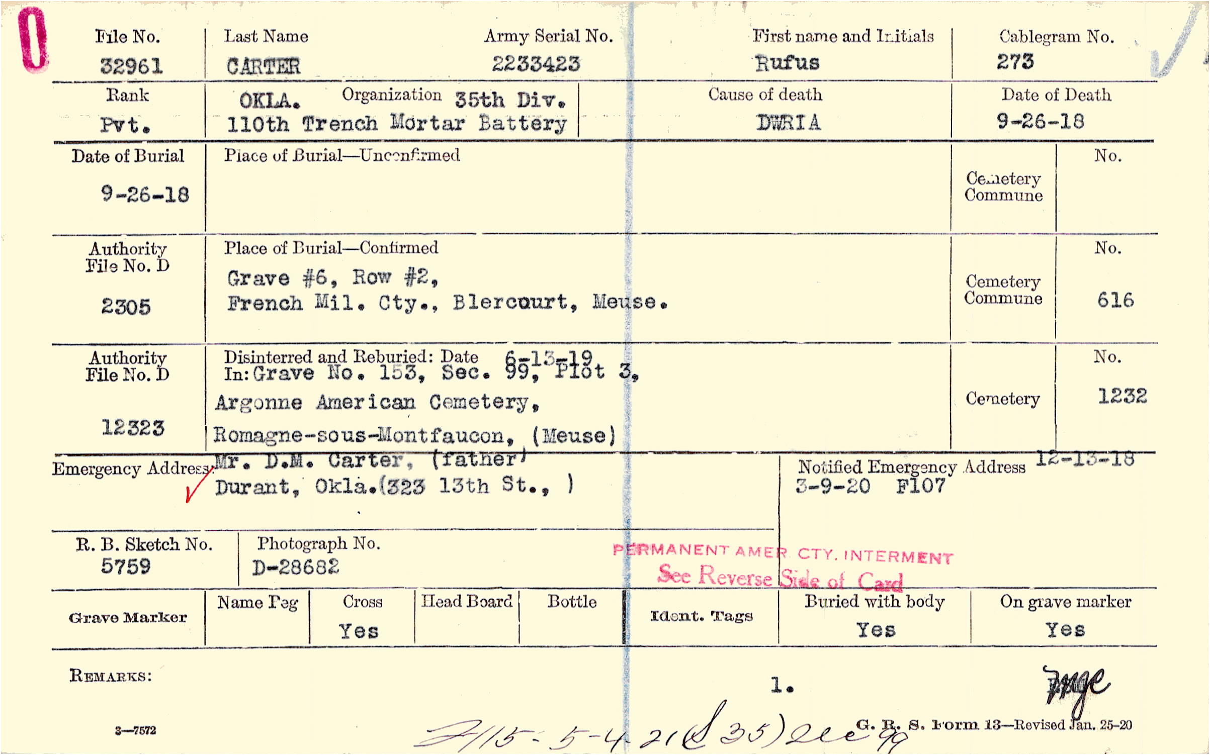 Mr. D.M. Carter, (father), Durant, Okla.(323 13th St., )