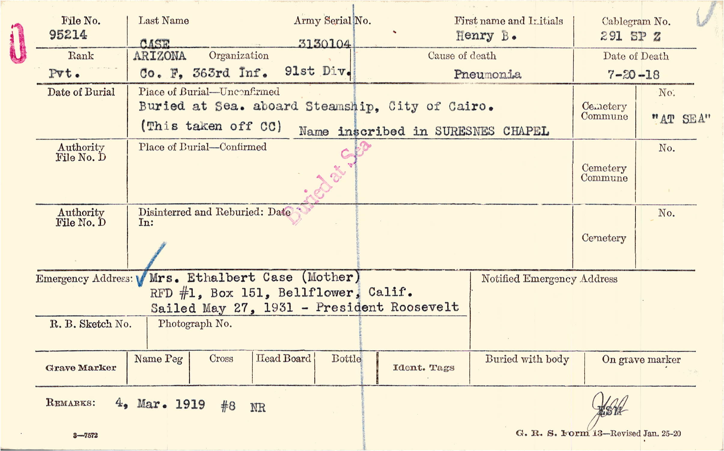 Buried at Sea. aboard Steamship, City of Cairo., (This taken off CC), Name inscribed in SURESNES CHAPEL