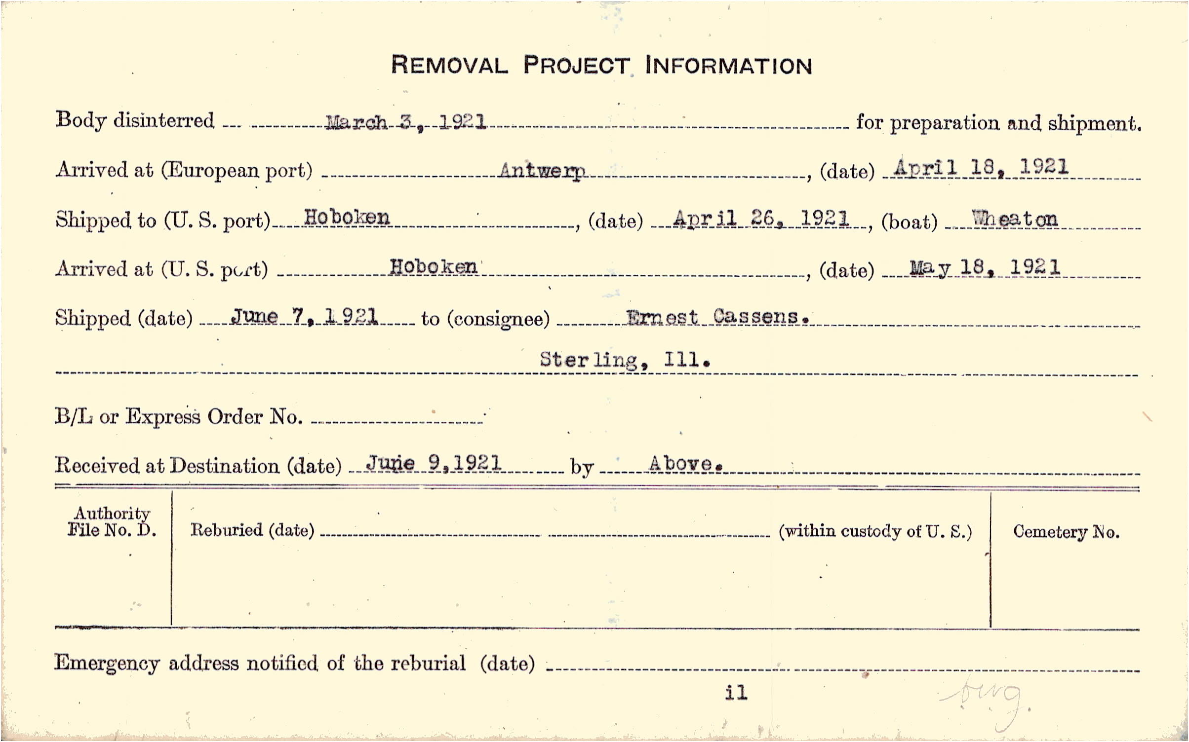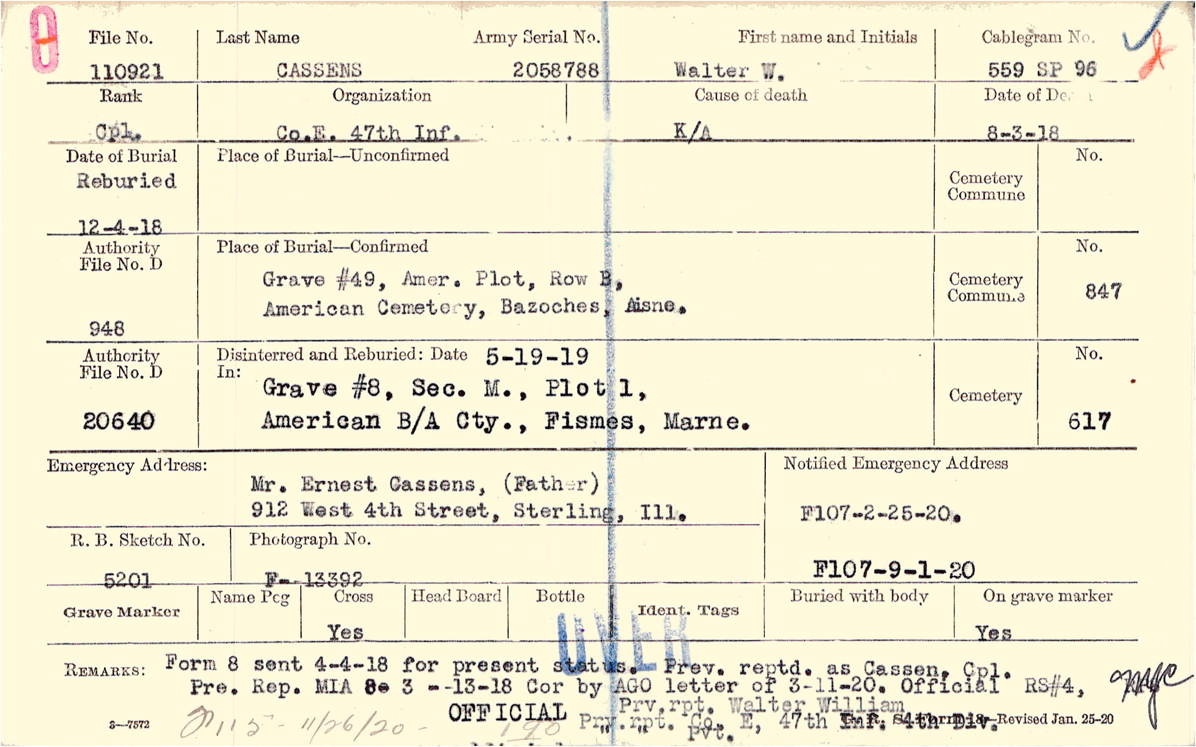 Prev. reptd. as Cassen, Cpl. Pre. Rep. MIA 3-13-18 Cor by AGO letter of 3-11-20. Official RS#4 Prv. rpt. Walter William Prv. rpt. Co. E, 47th Inf. 4th Div. Prv. rpt. Pvt., Form 8 sent 4-4-18 for present status., F115 - 11/26/20 - 190