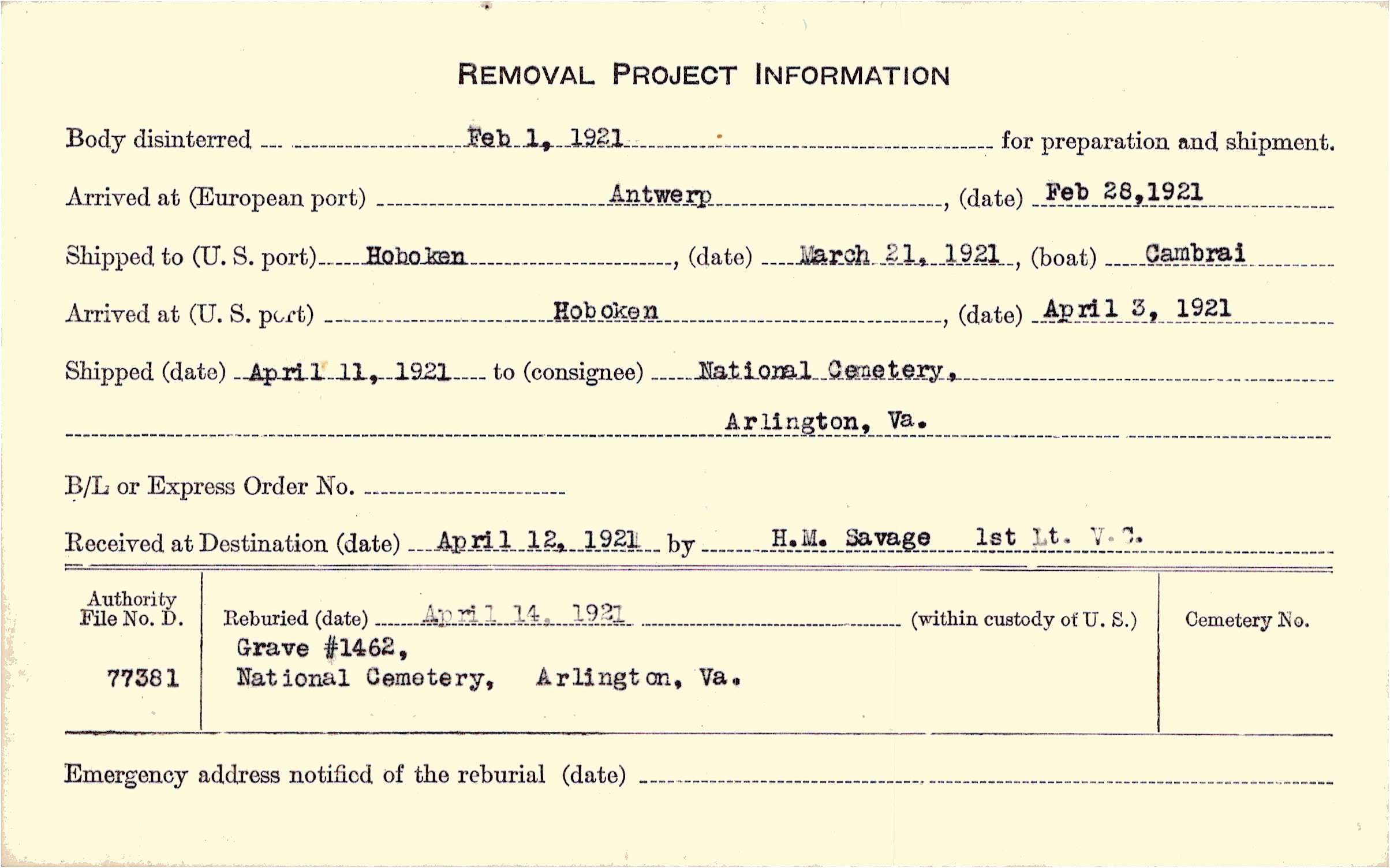Body disinterred 2/1/1921 for preparation and shipment.