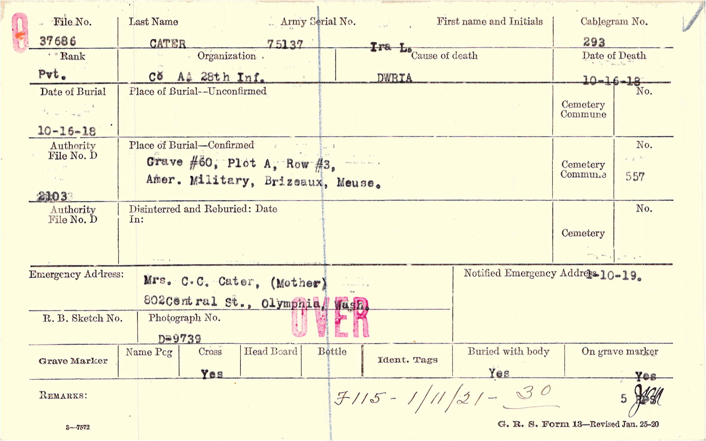 Mrs. C.C. Cater, (Mother), 802Central St., Olymphia, Wash.