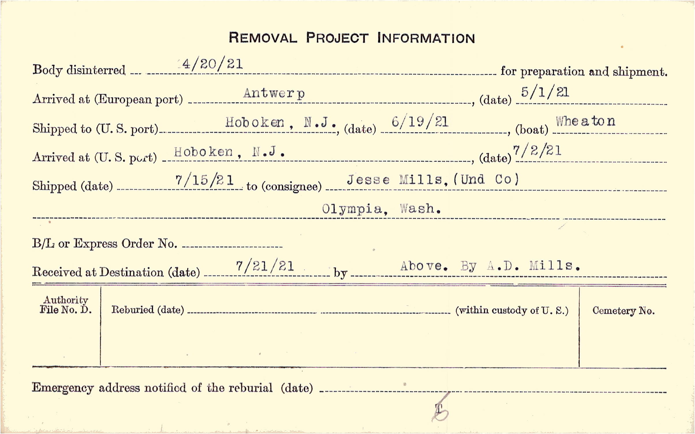 Body disinterred 4/20/1921 for preparation and shipment.