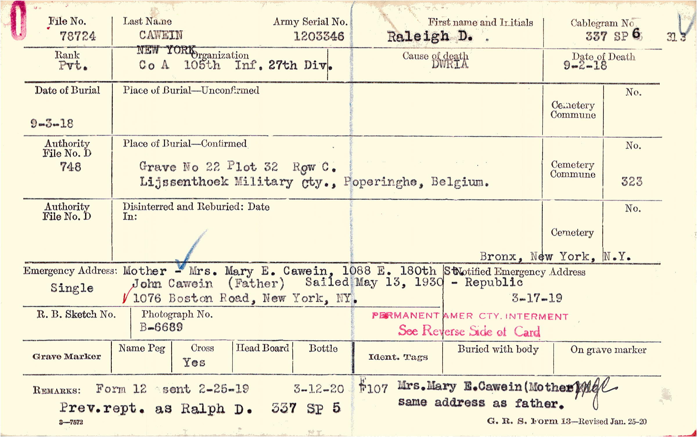3-12-20 F107 Mrs. Mary E. Cawein (Mother) same address as father Prev. rept. as Ralph D. 337 SP 5, Form 12 sent 2-25-19