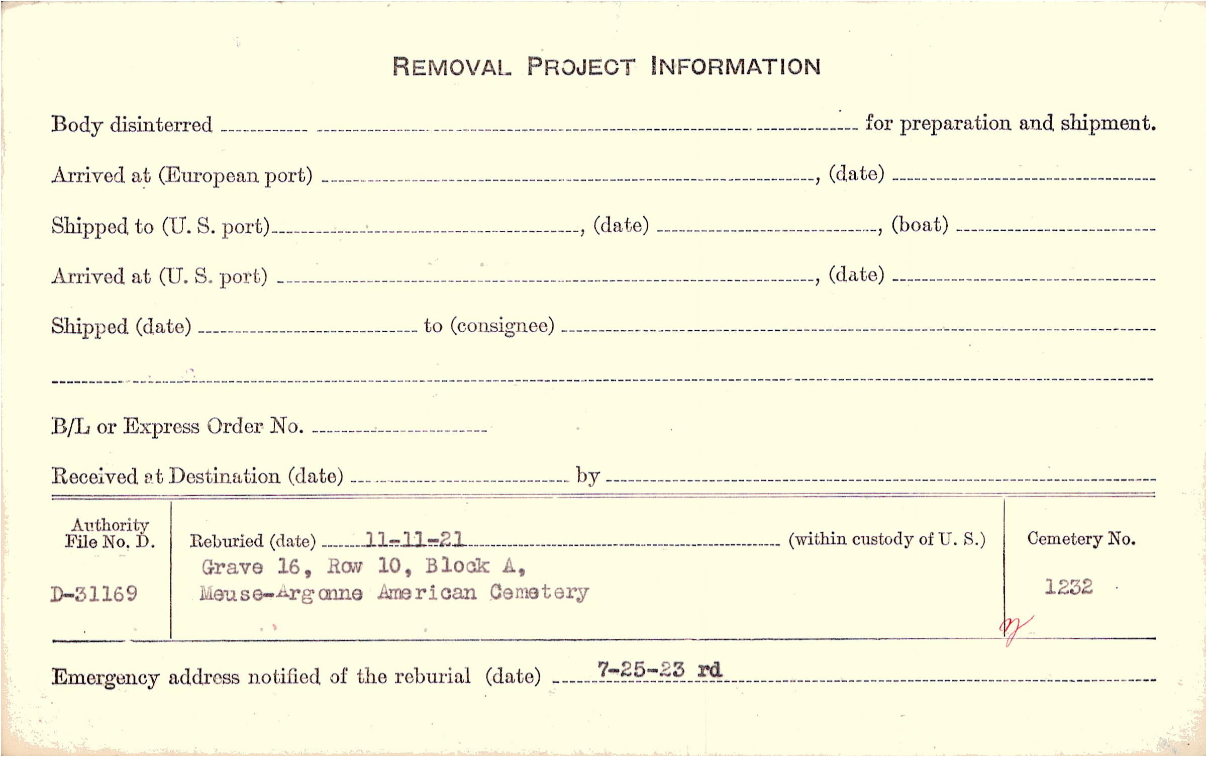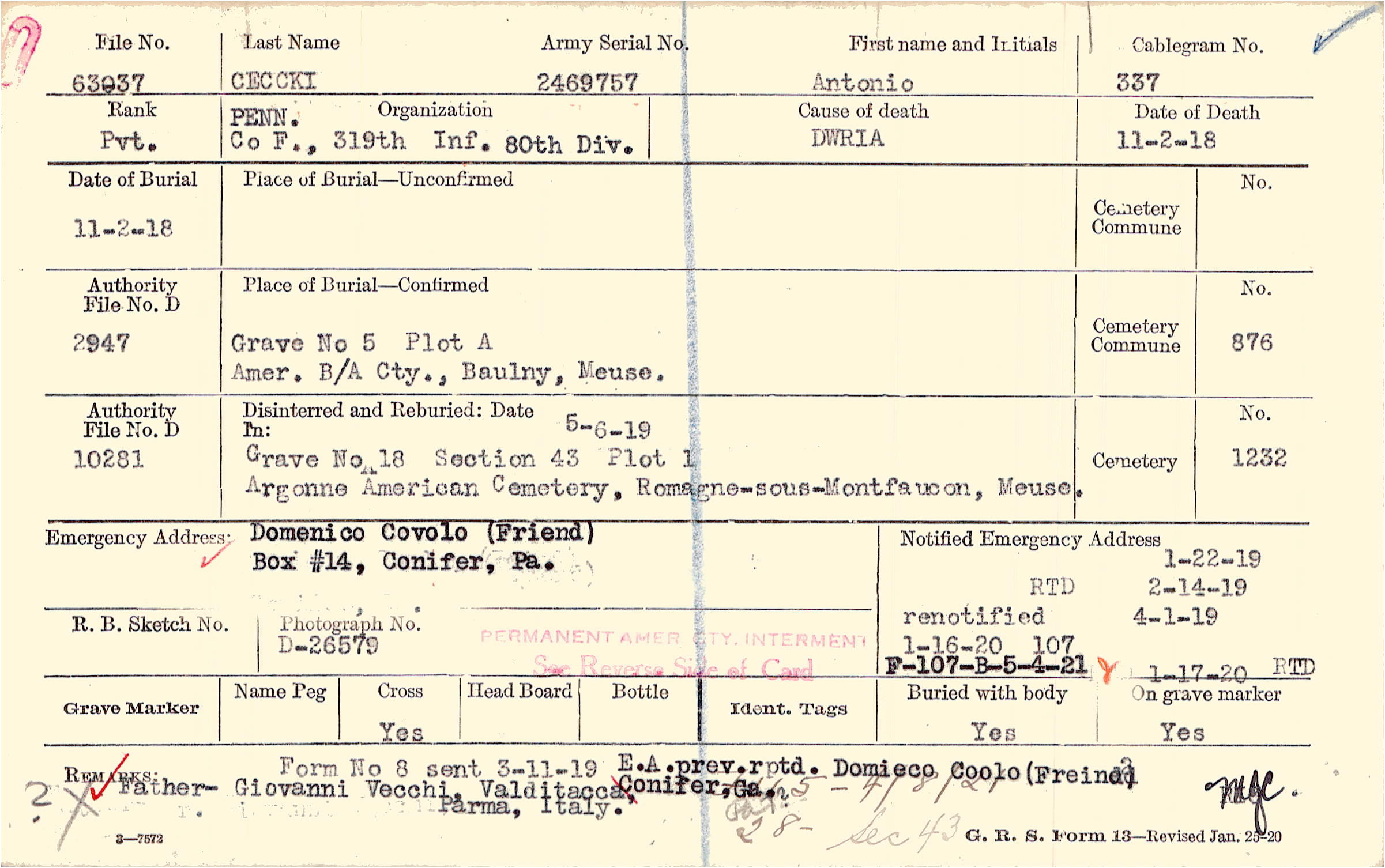 1/22/1919, RTD 2/14/1919, renotified 4/1/1919, Form 107: 1/16/1920, Form 107: B 5/4/19 Form 21: , 1/17/1920 RTD