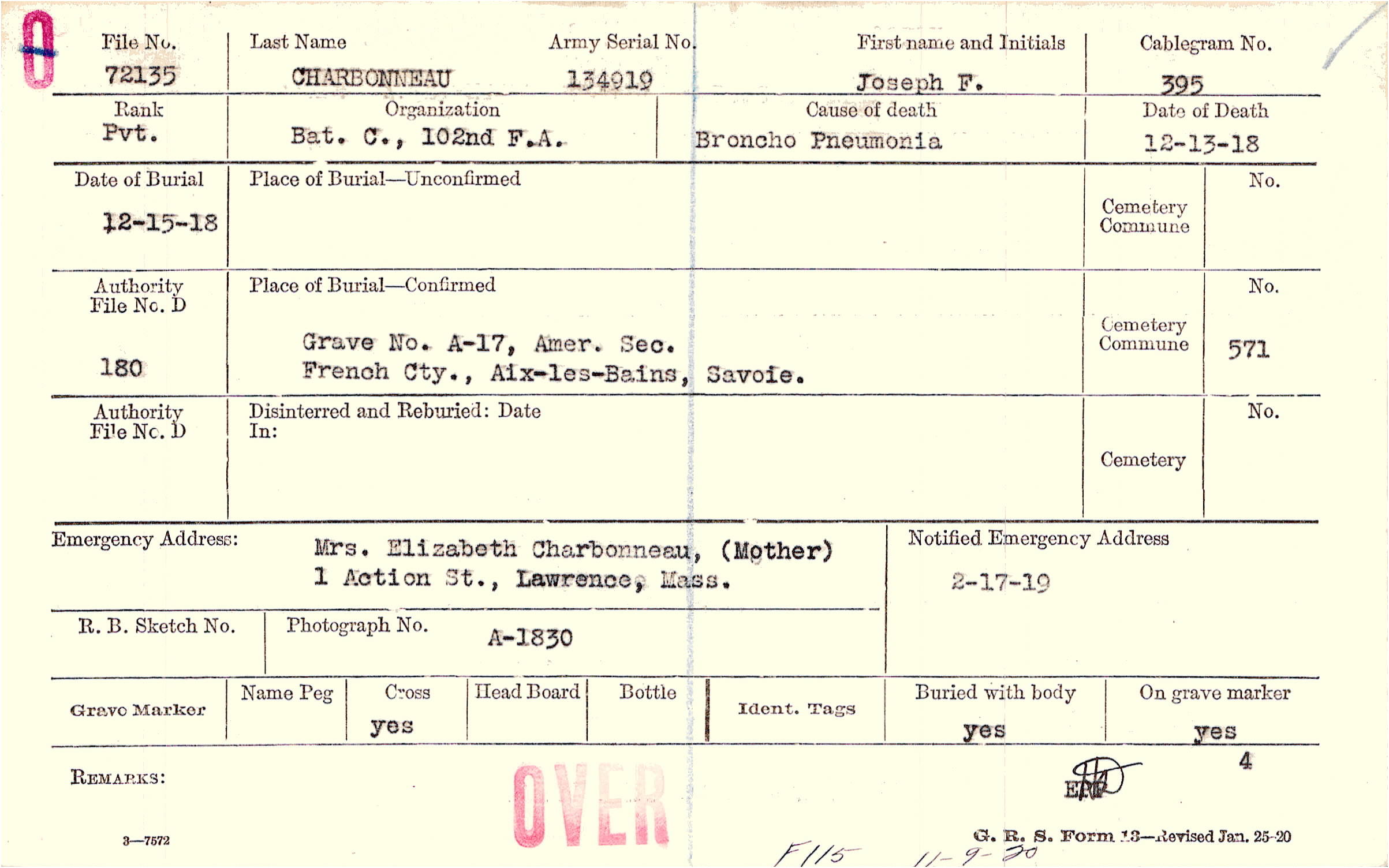 Grave A-17, Amer. Sec., French Cty., Aix-les-Bains, Savoie