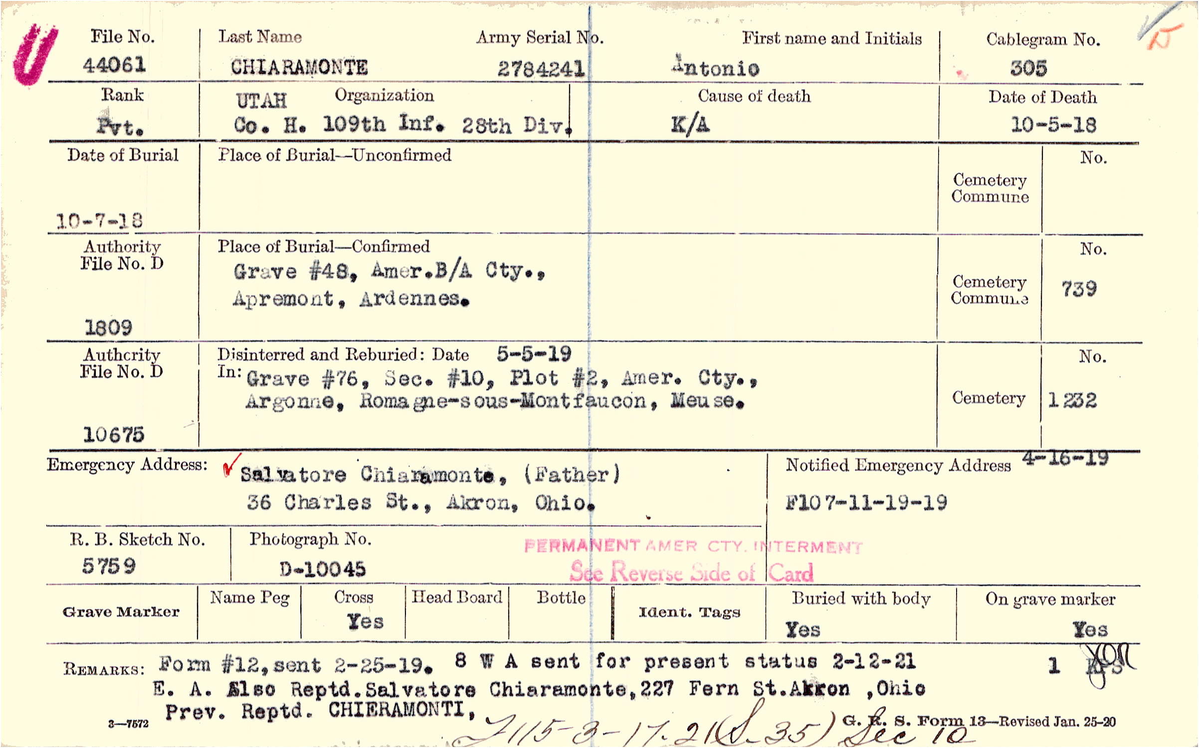Salvatore Chiaramonte, (Father), 36 Charles St., Akron, Ohio.