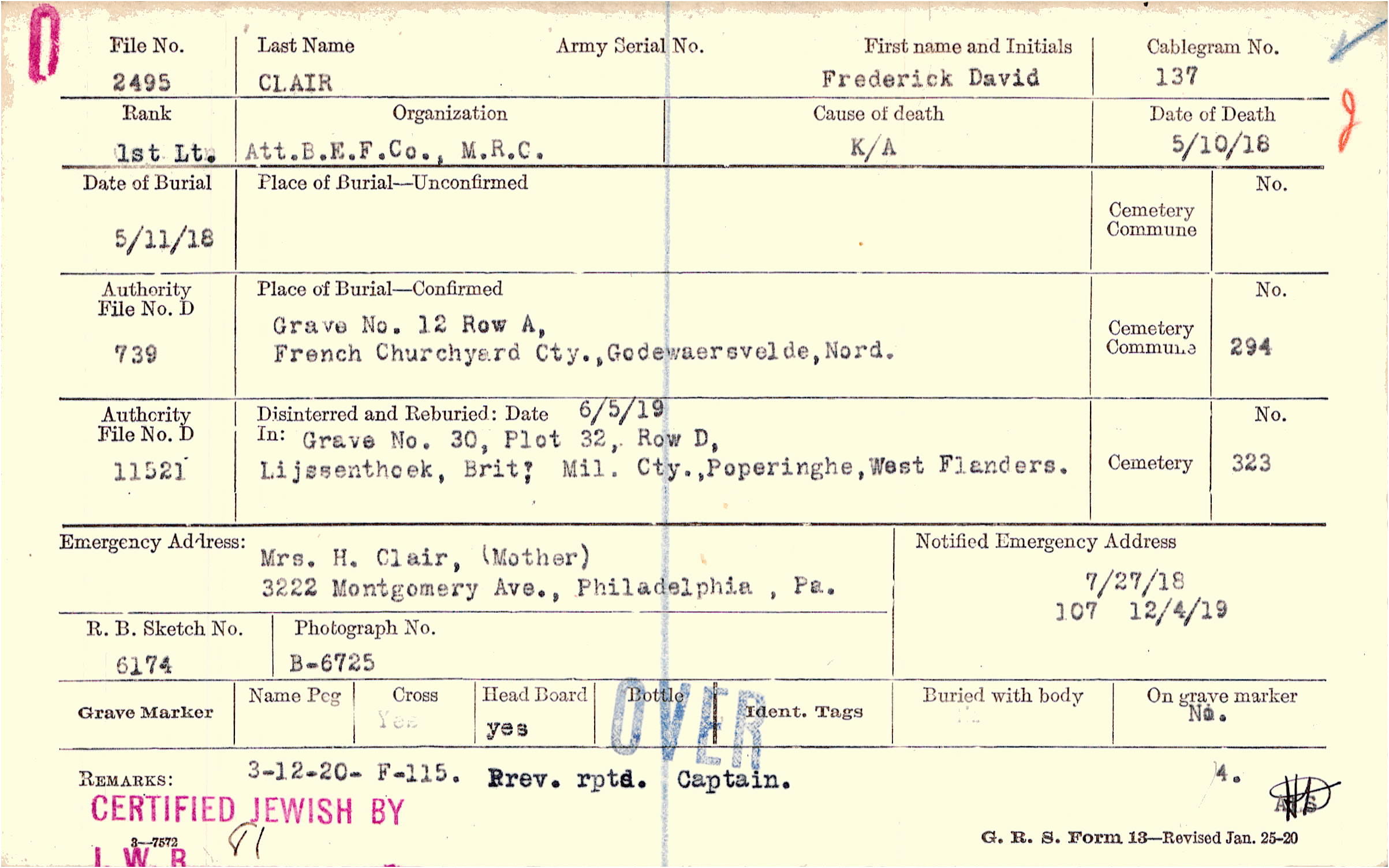 Mrs. H. Clair, (Mother), 3222 Montgomery Ave., Philadelphia , Pa.