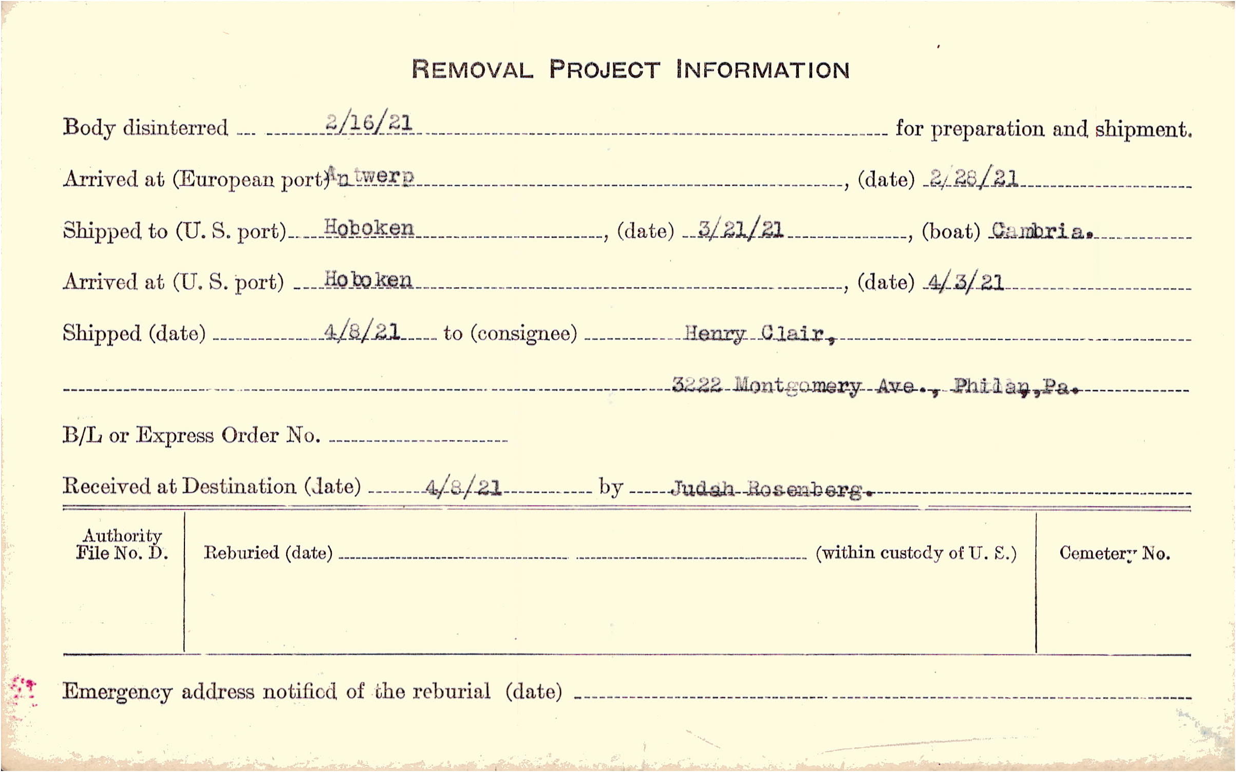 Body disinterred 2/16/1921 for preparation and shipment.