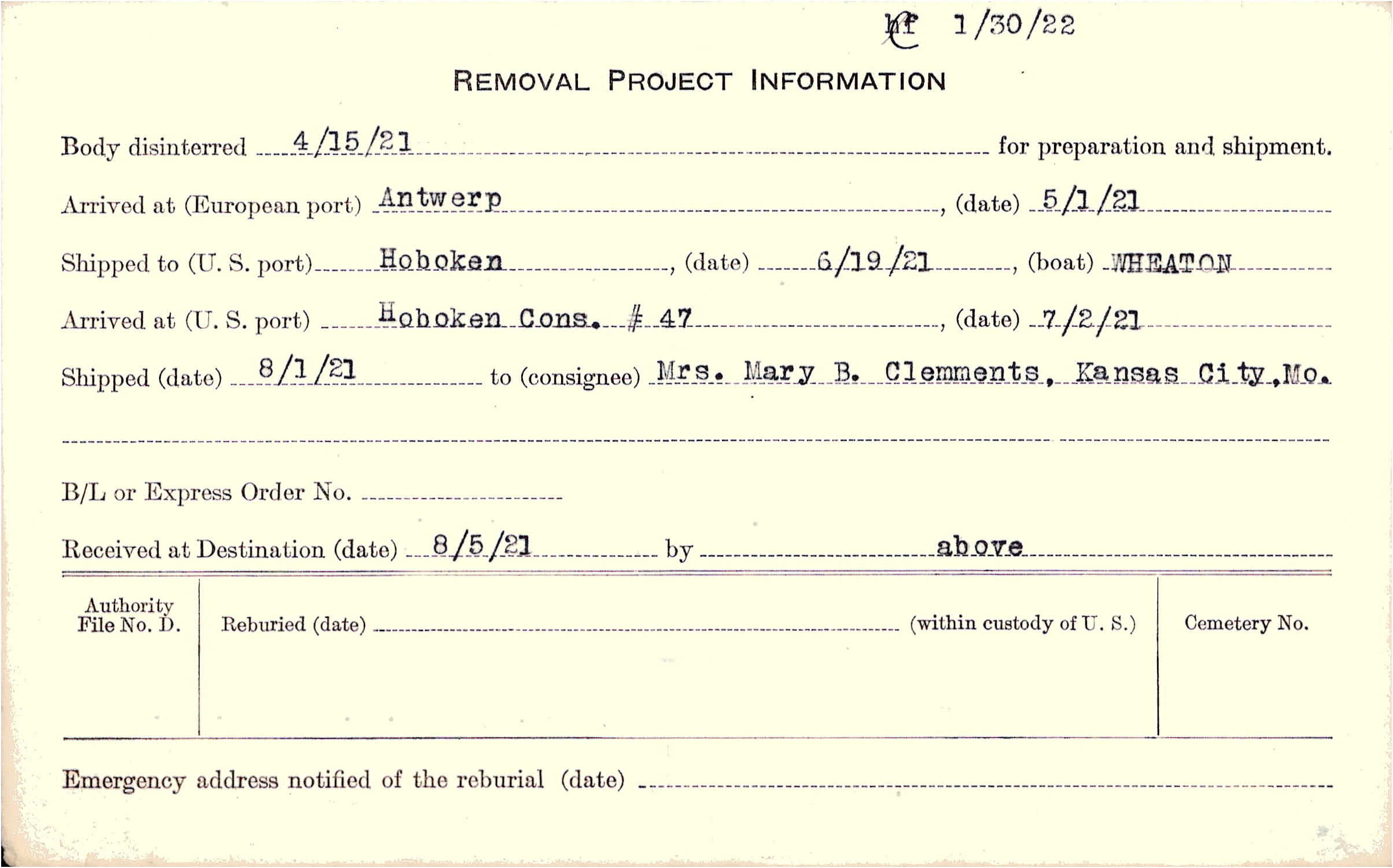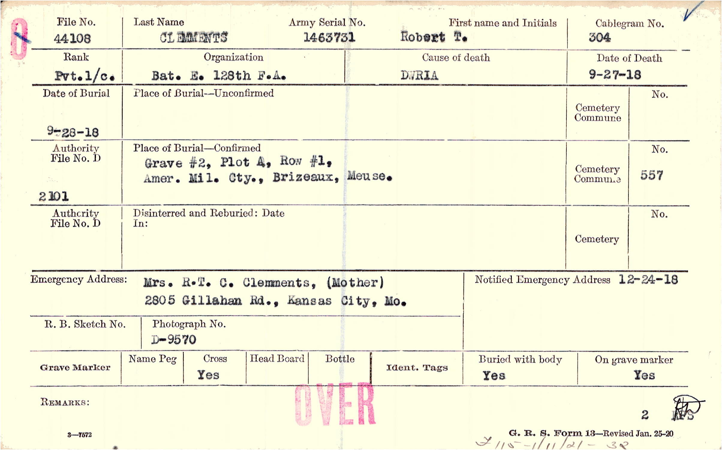 Mrs. R.T. C. Clemments, (Mother), 2805 Gillahan Rd., Kansas City, Mo.