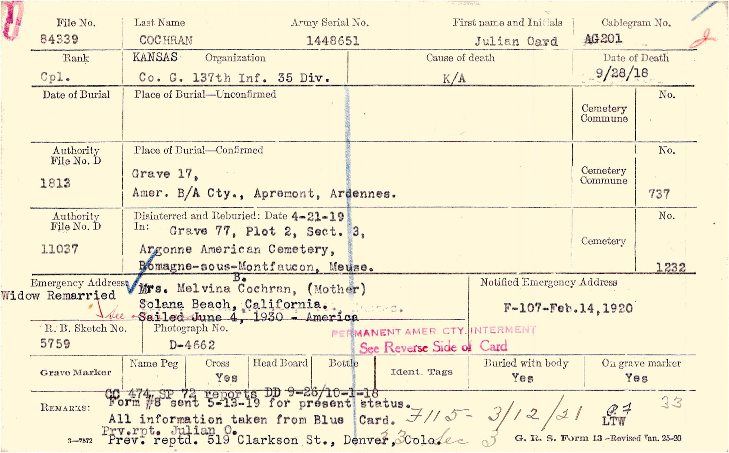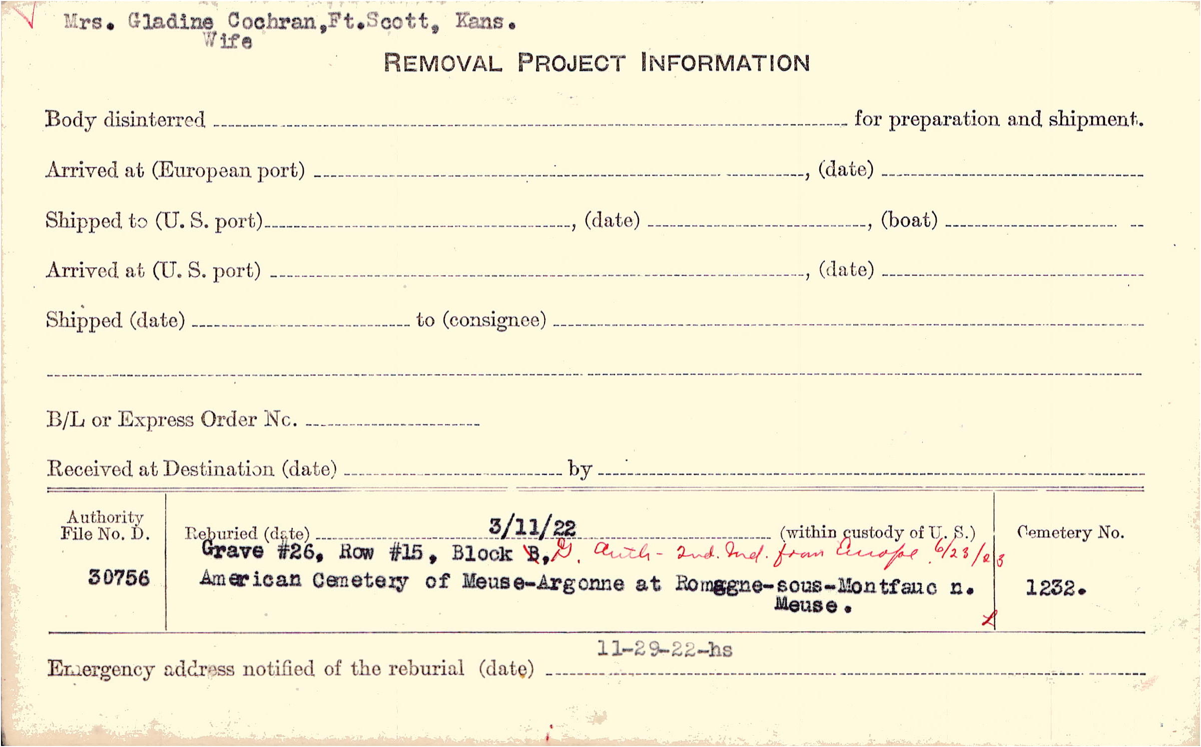 Mrs. Gladine Cochran, Ft. Scott, Kans. Wife. Auth - 2nd Ind. from Europe 6/23/23 |