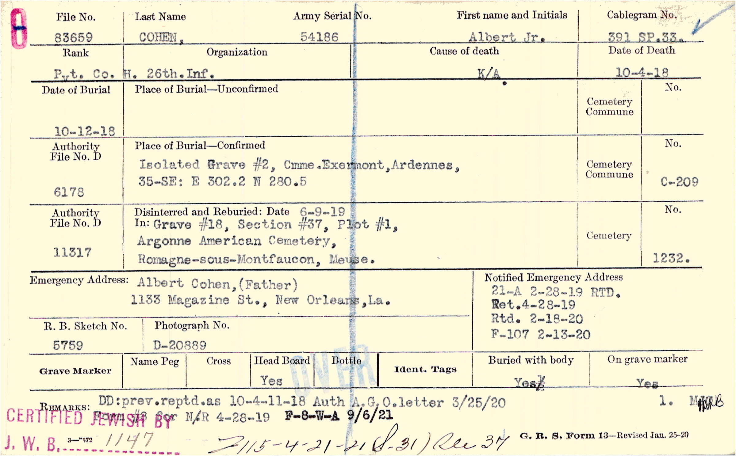Albert Cohen,(Father), 1133 Magazine St., New Orleans,La.