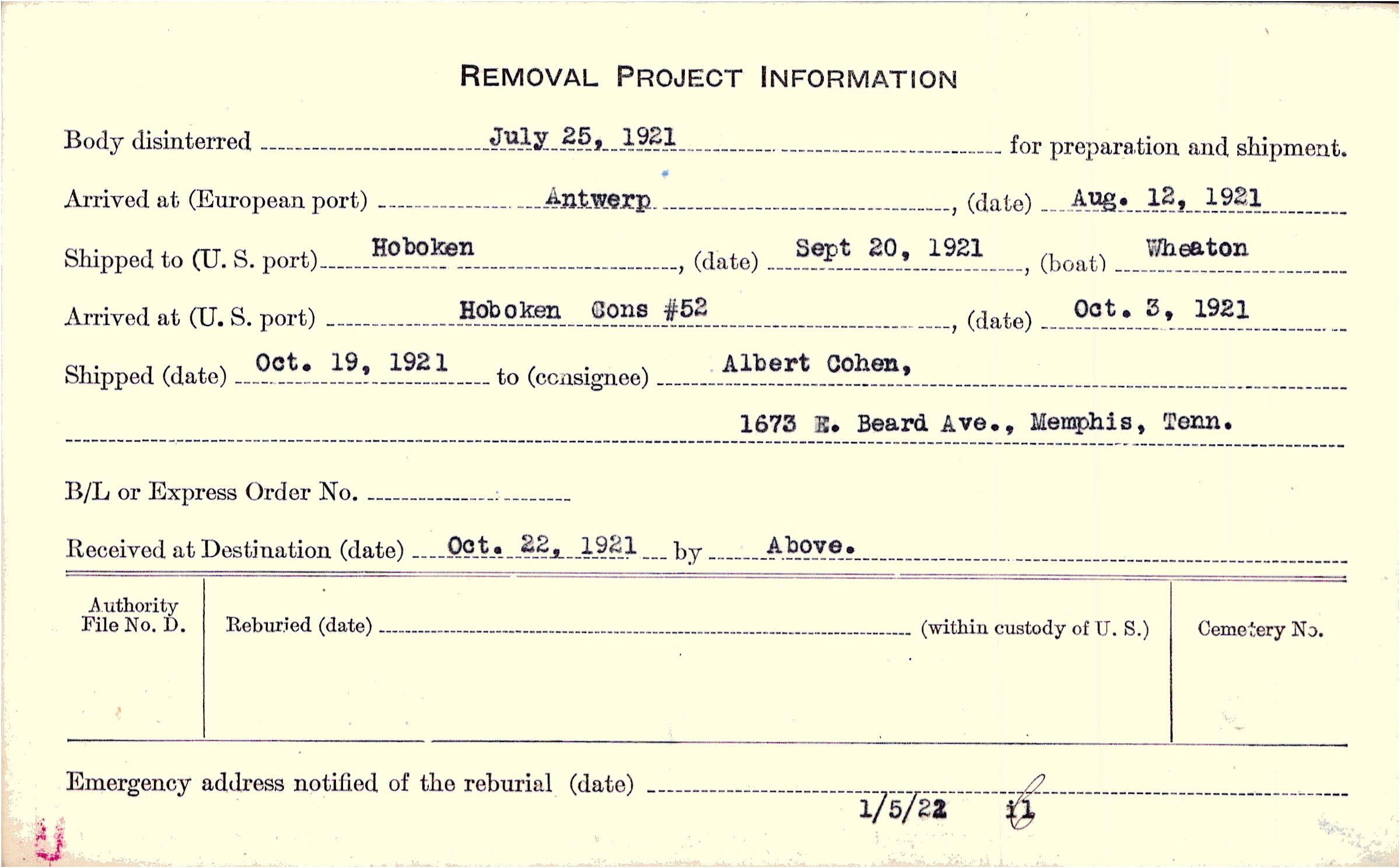 Body disinterred 7/25/1921 for preparation and shipment.