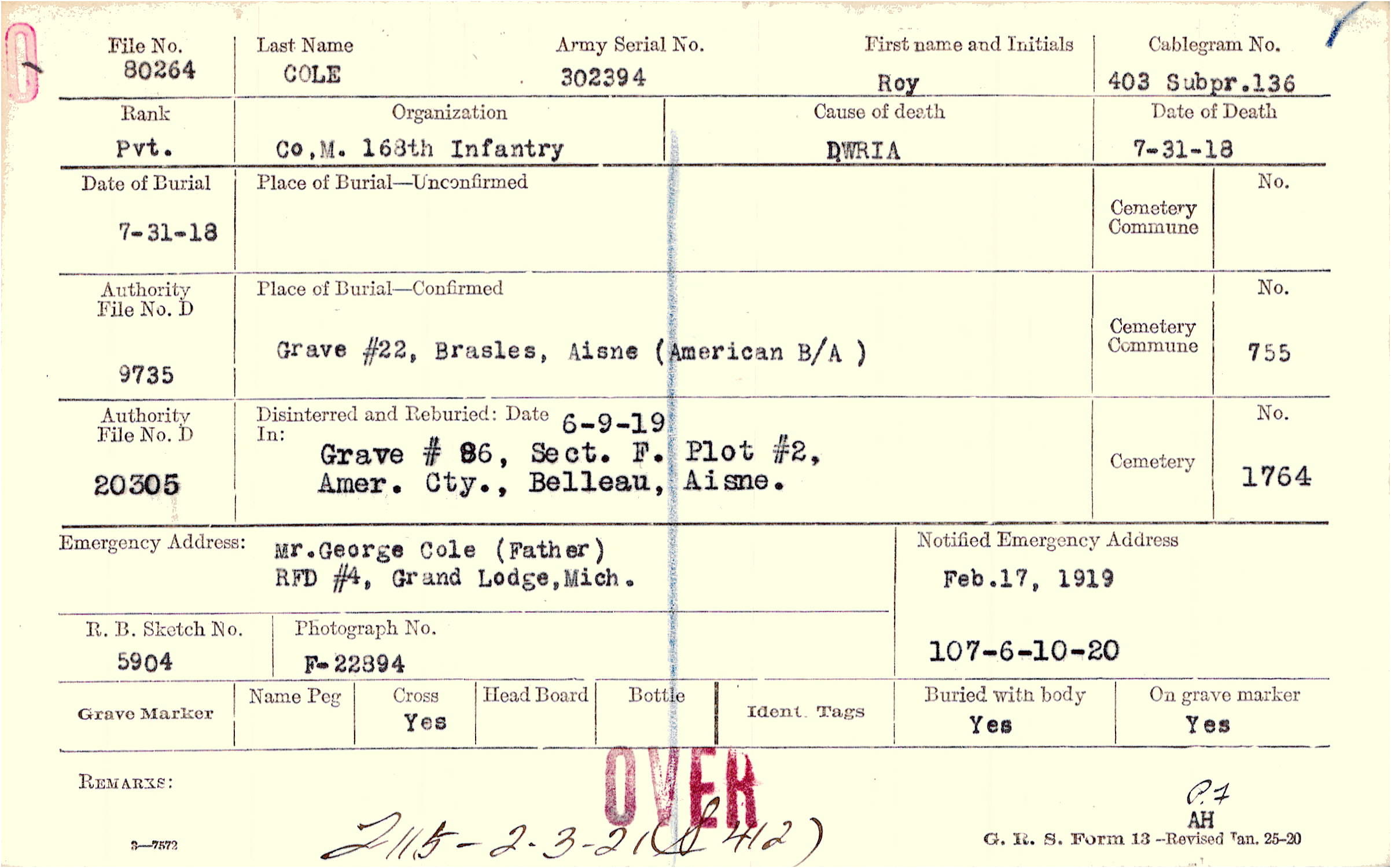 Mr. George Cole (father), RFD #4, Grand Lodge, Mich.