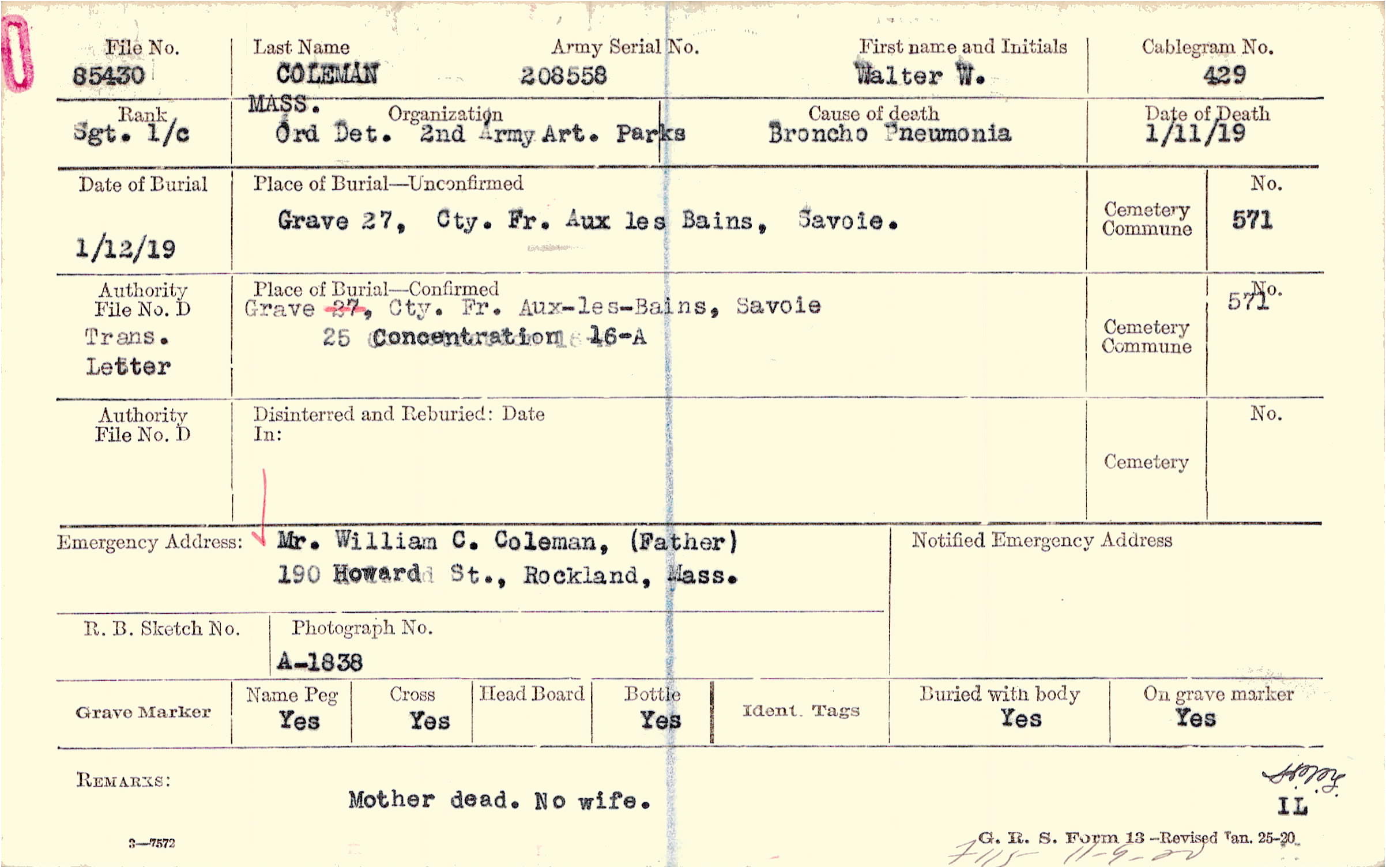 Mr. William C. Coleman, (Father), 190 Howard St., Rockland, Mass.