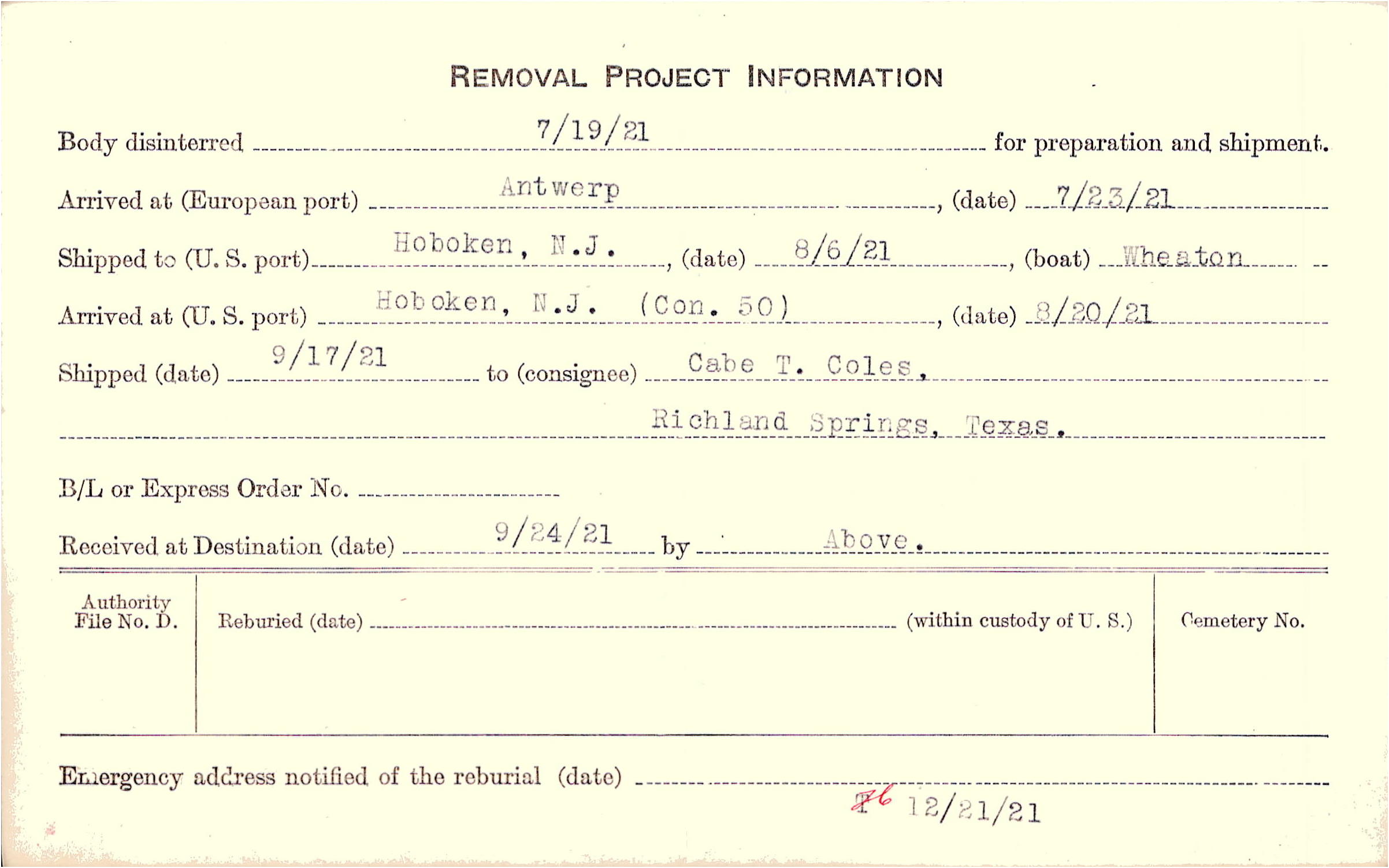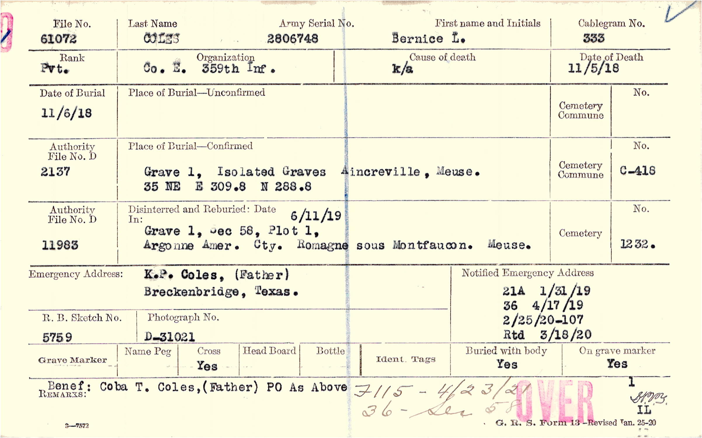 Benef: Coba T. Coles, (Father) PO as above, F115 - 4/23/21 36 - Sec 58