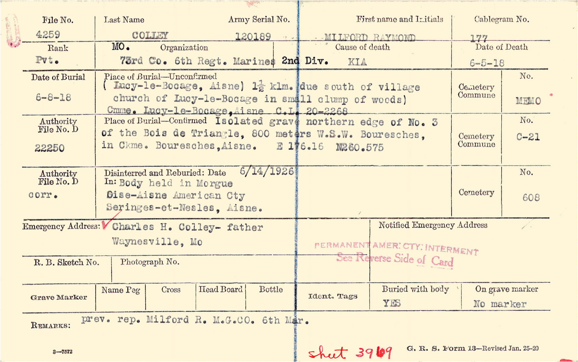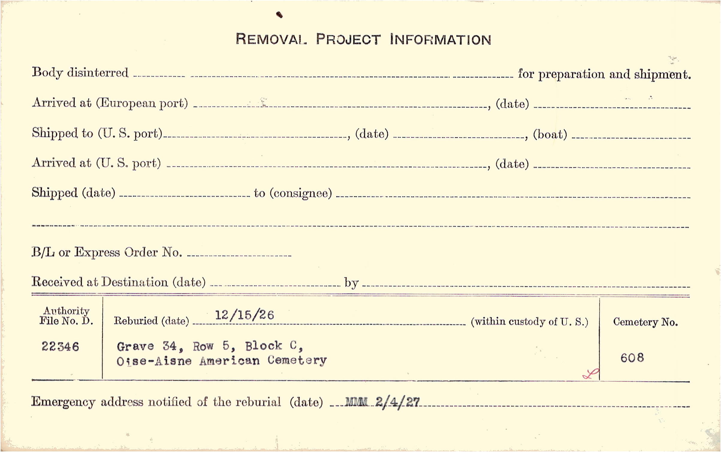 American B/A Cemetery, Seringes-et-Nesles, Aisne, Body held in Morgue