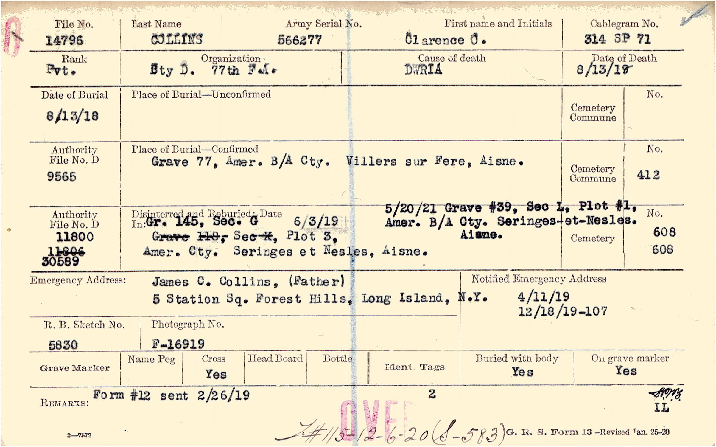 to Mrs. Clara Collins, Maple Grove Cemetery, Richmond Hill, N.Y.