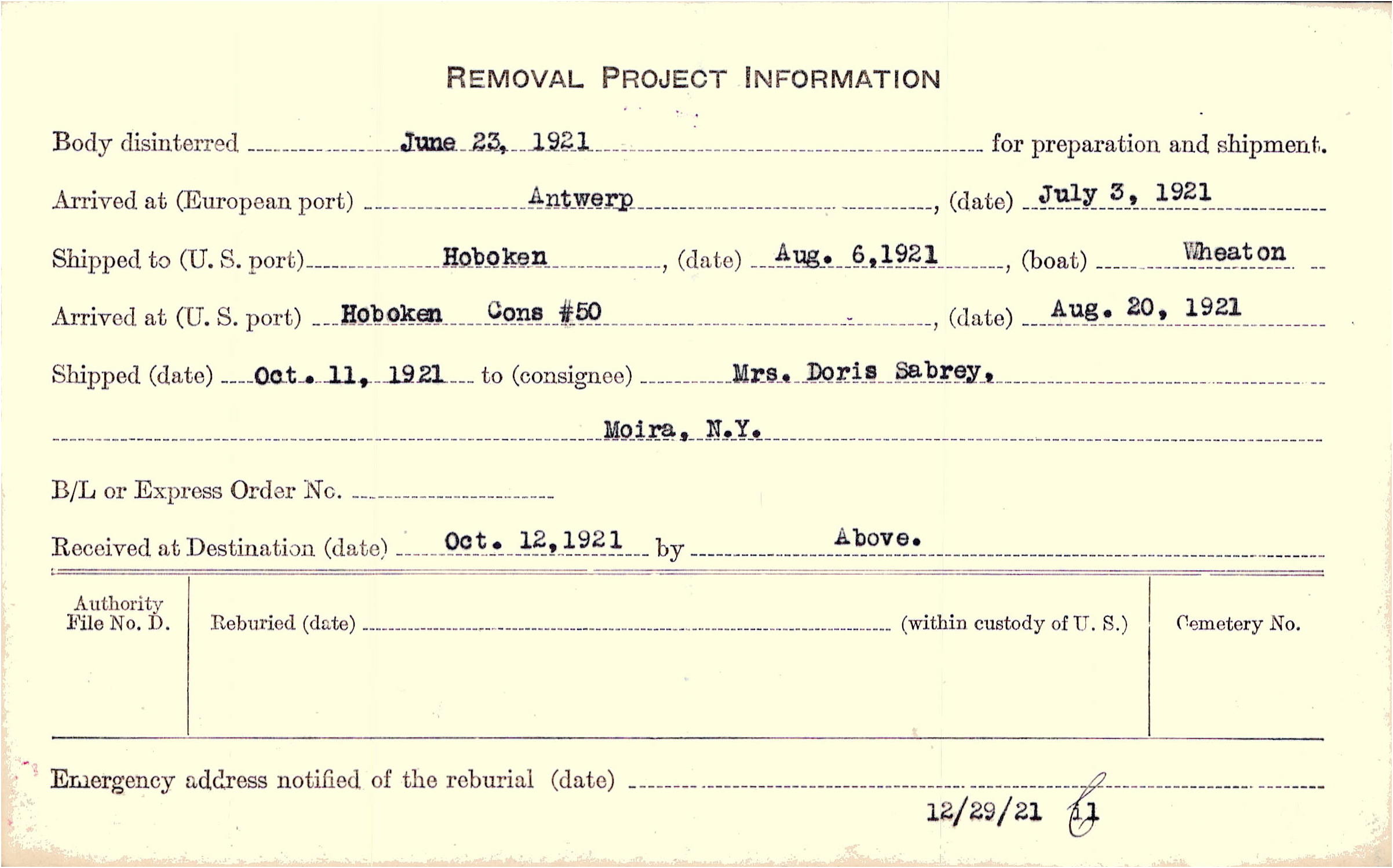 Body disinterred 6/23/1921 for preparation and shipment.