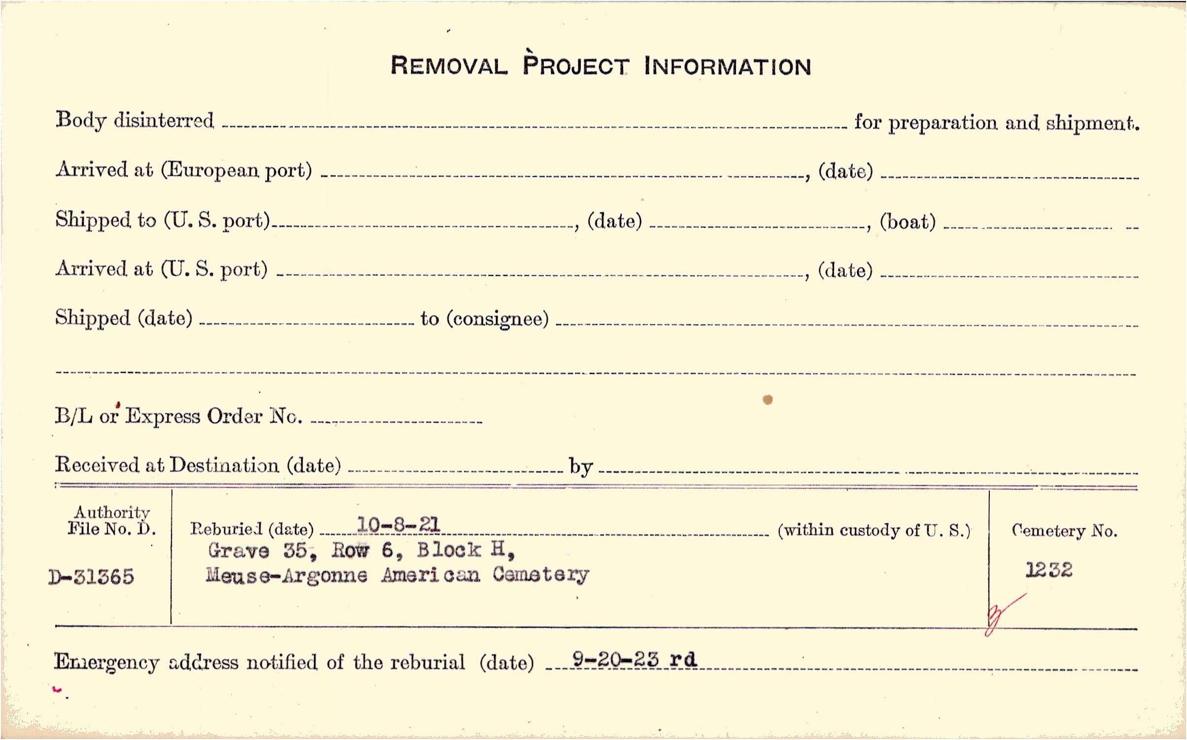 | Permanent Burial in Foreign Cemetery |