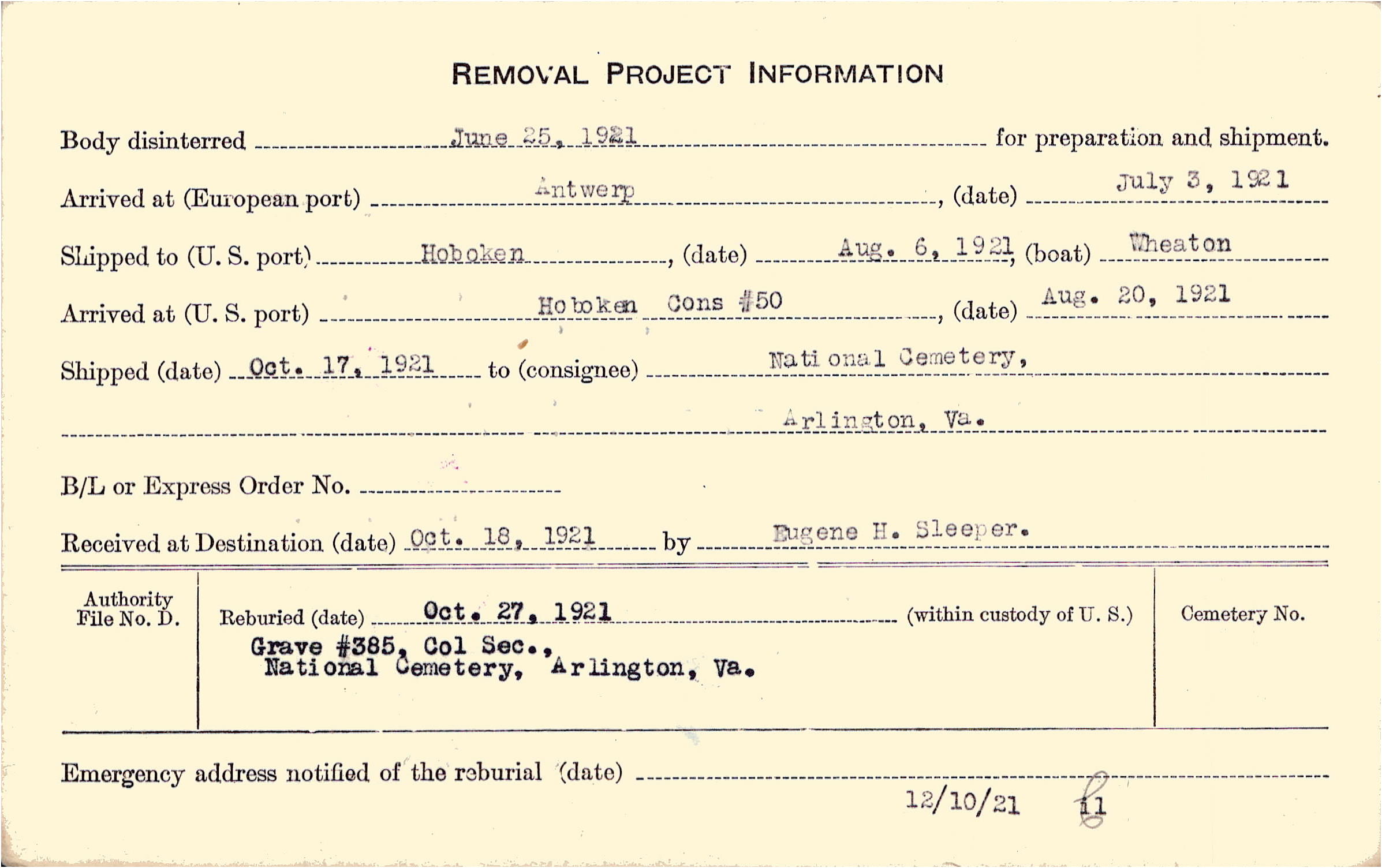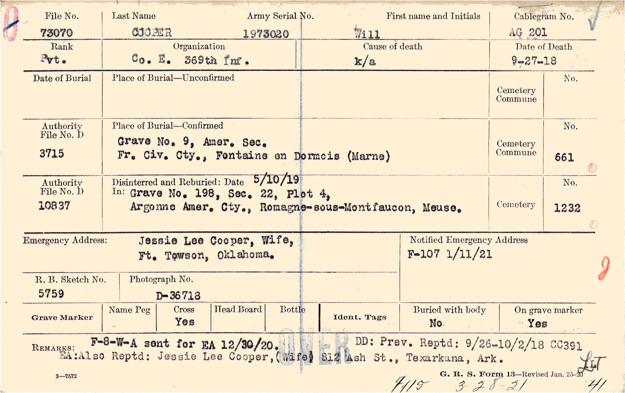 DD: Prev. Reptd: 9/26-10/2/18 CC391 EA: Also Reptd: Jessie Lee Cooper, (Wife) 812 Ash St., Texarkana, Ark., F-8-W-A sent for EA 12/30/20., F115 3-28-21