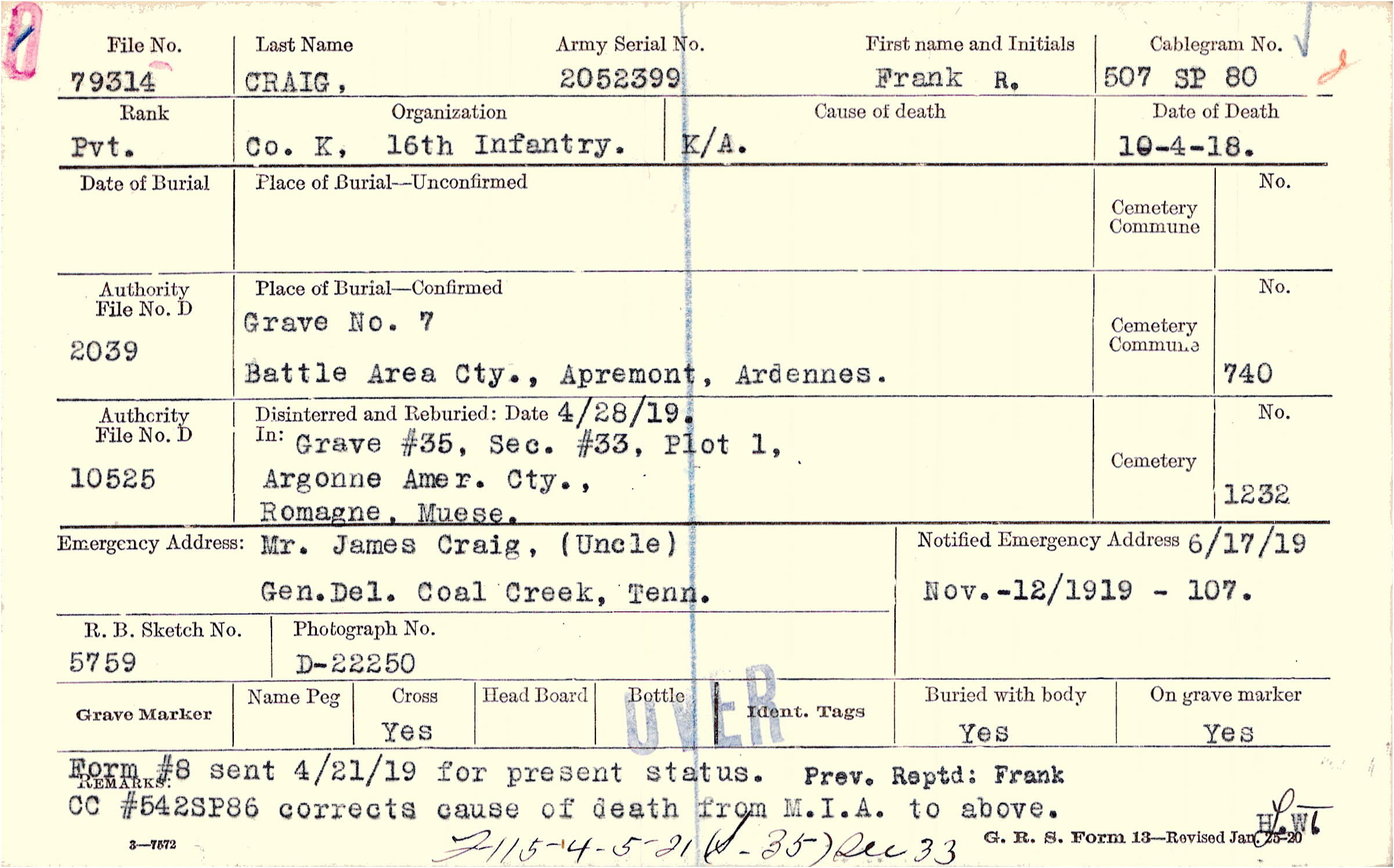 Pre.Reptd:Frank CC#542SP86 corrects cause of death from M.I.A. to above., Form #8 sent 4/21/19 for present status. Prev. Reptd: Frank CC #542SP86 corrects cause of death from M.I.A to above. 7115-4-5-21(S-35)Dec 33, F115-4-5-21 (S-35) Sec 33