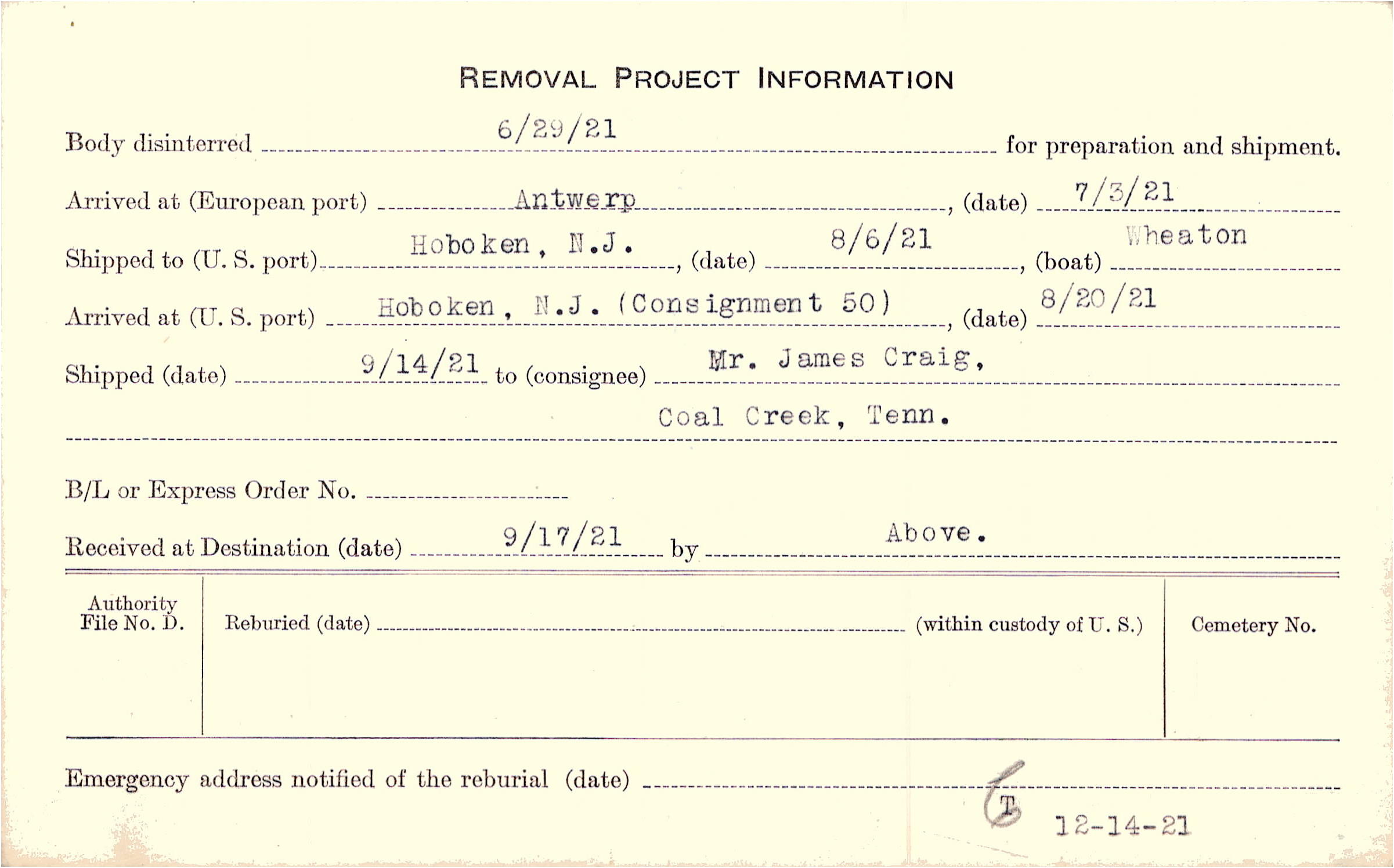 Mr. James Craig, (Uncle), Gen. Del. Coal Creek, Tenn.
