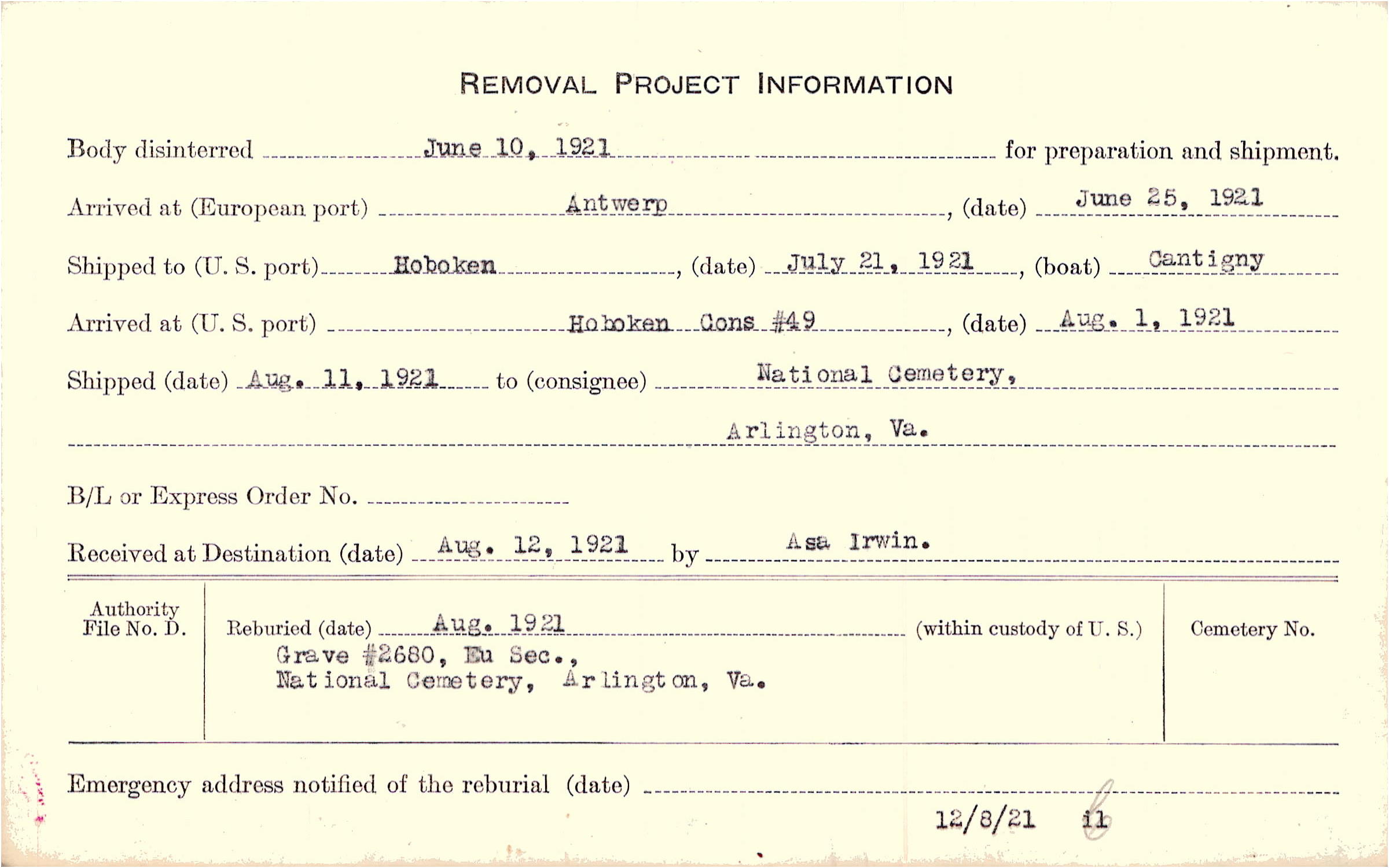 Body disinterred 6/10/1921 for preparation and shipment.