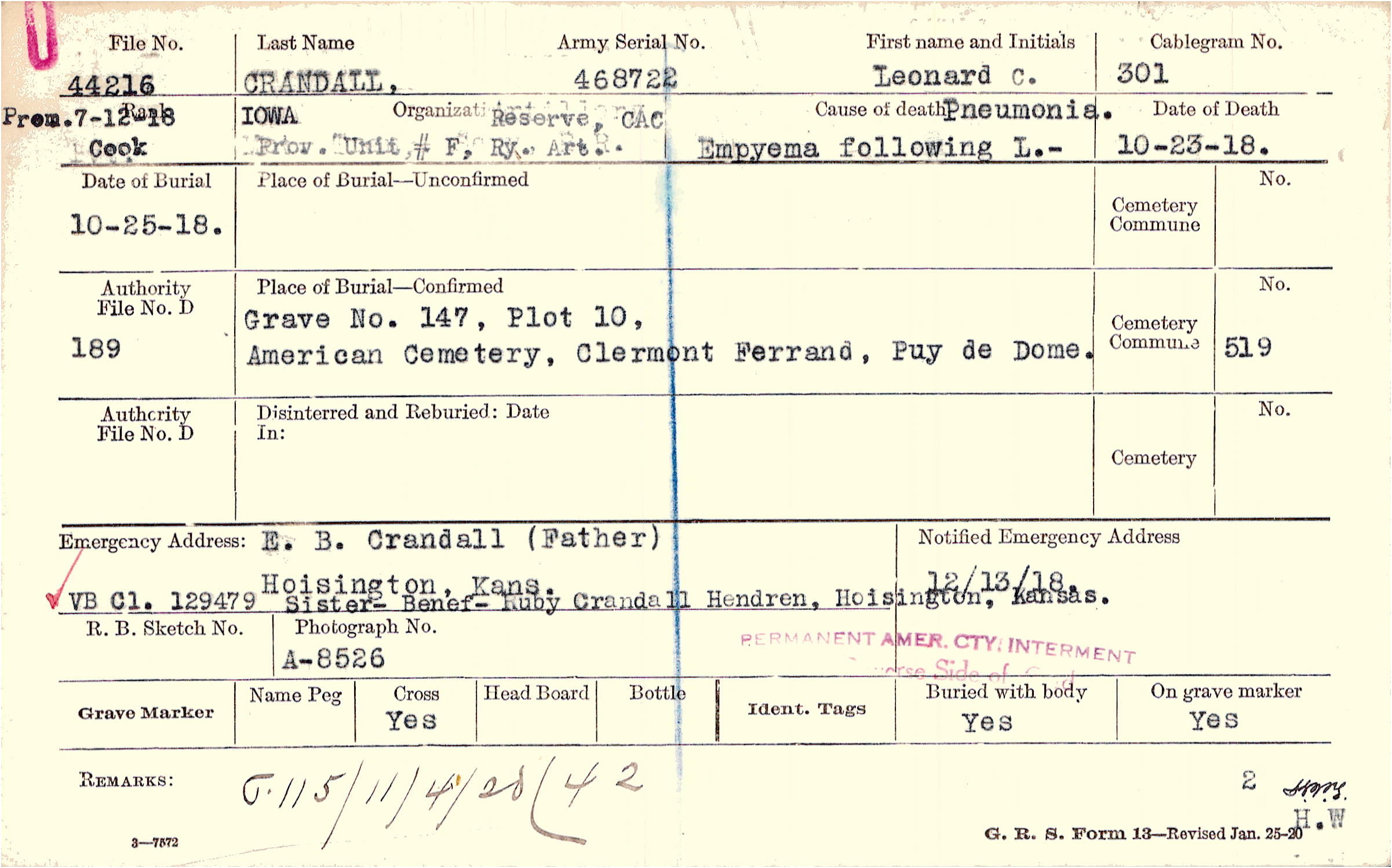 E. B. Crandall (Father), Hoisington, Kans., VB Cl. 129479 Sister- Benef- Ruby Crandall Hendren, Hoisington, Kansas.