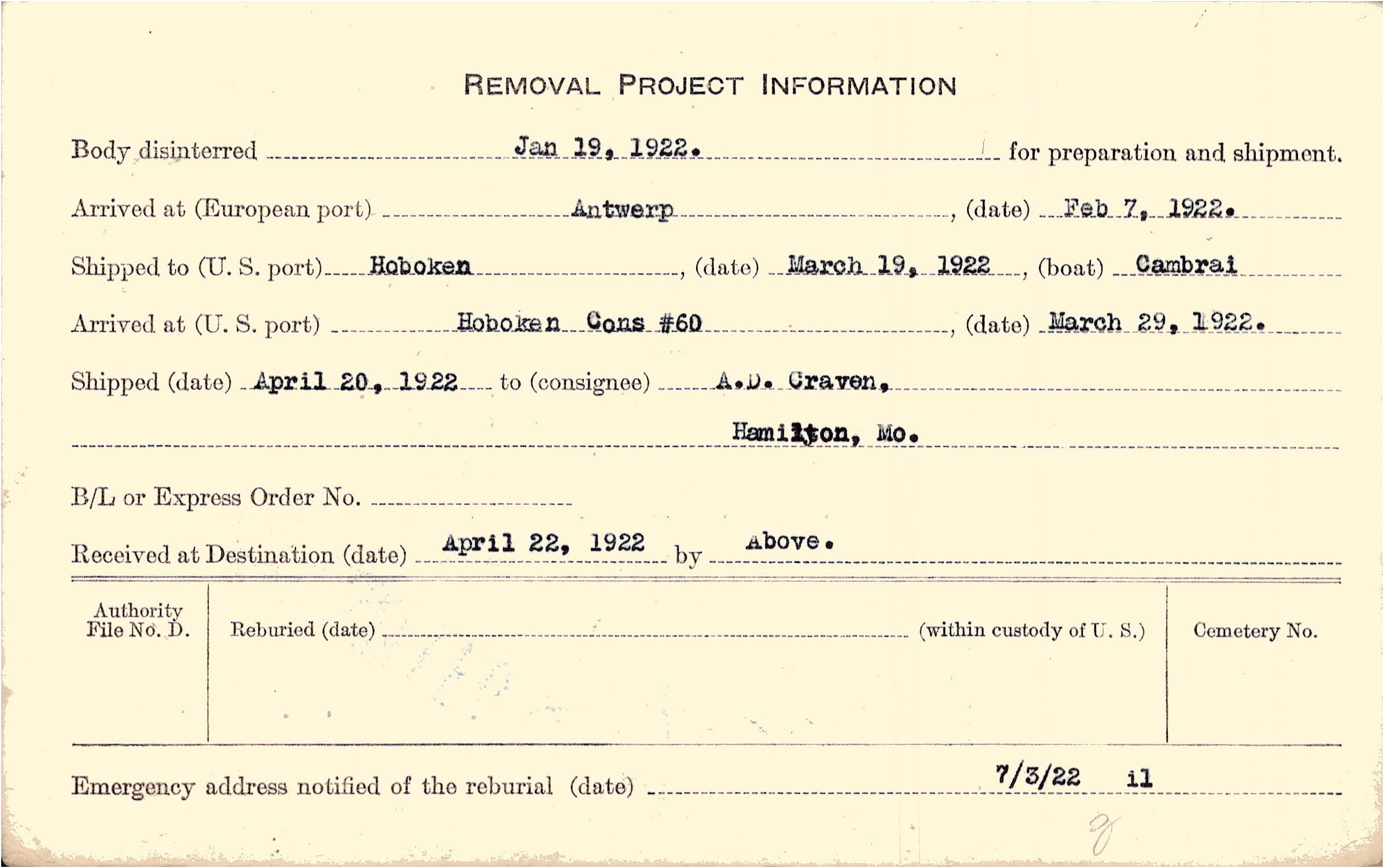 Prev. rptd. Pvt. E.A. also reptd. Mrs. Alonzo D. Craven., Form #8 sent 4/3/19 Present Status, 11-26-20-254