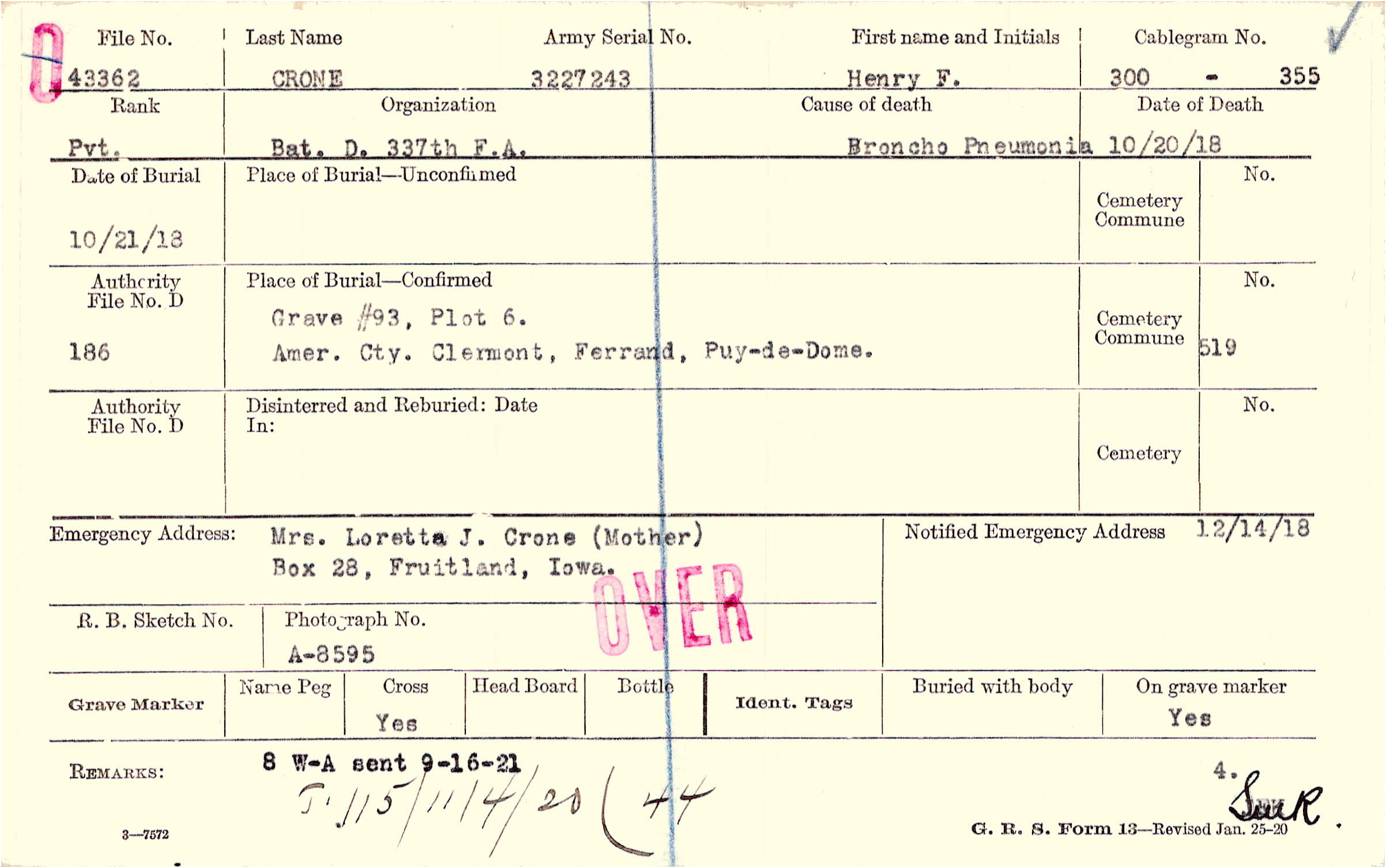 Mrs. Loretta J. Crone (Mother), Box 28, Fruitland, Iowa.
