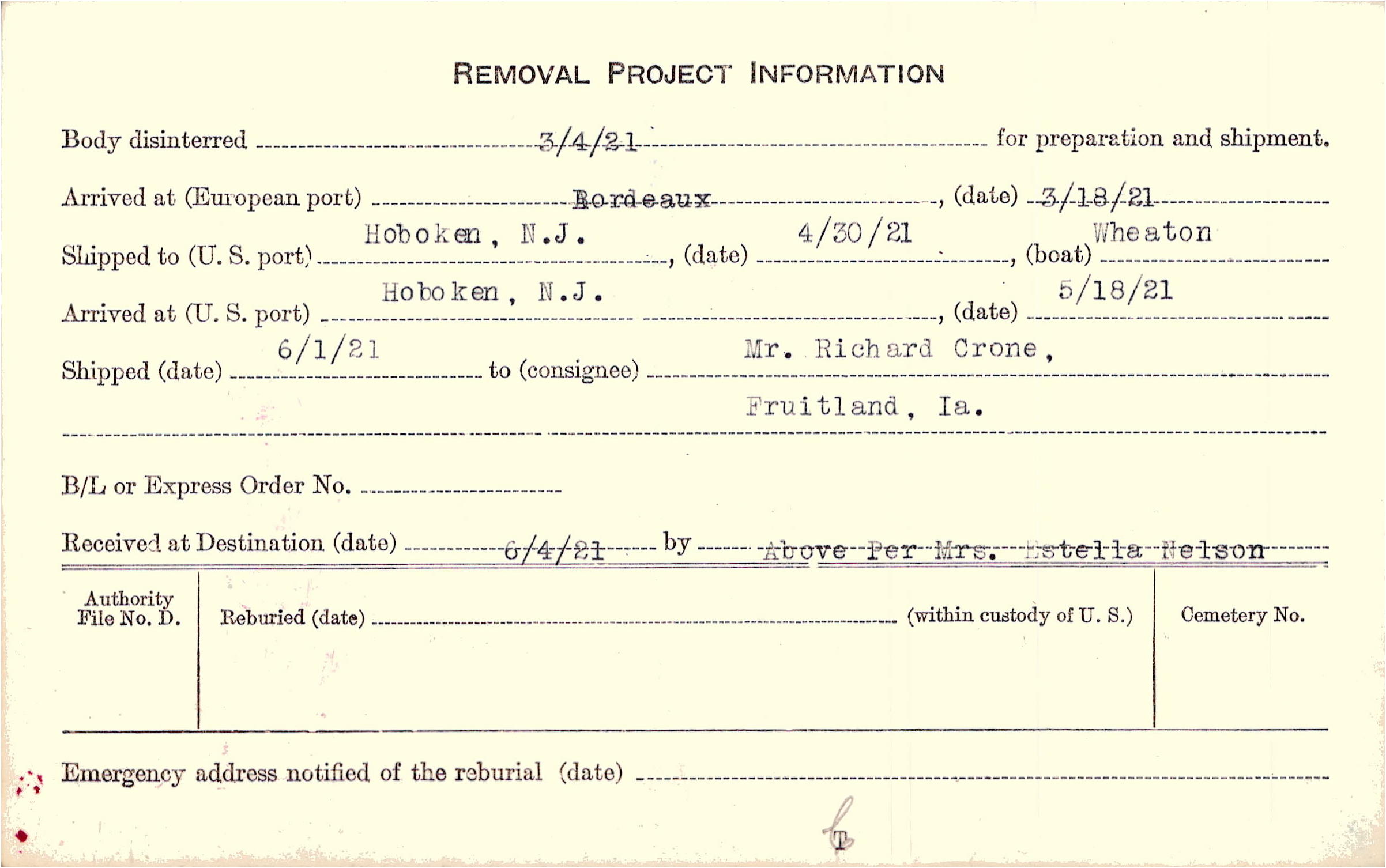 Body disinterred 3/4/1921 for preparation and shipment.